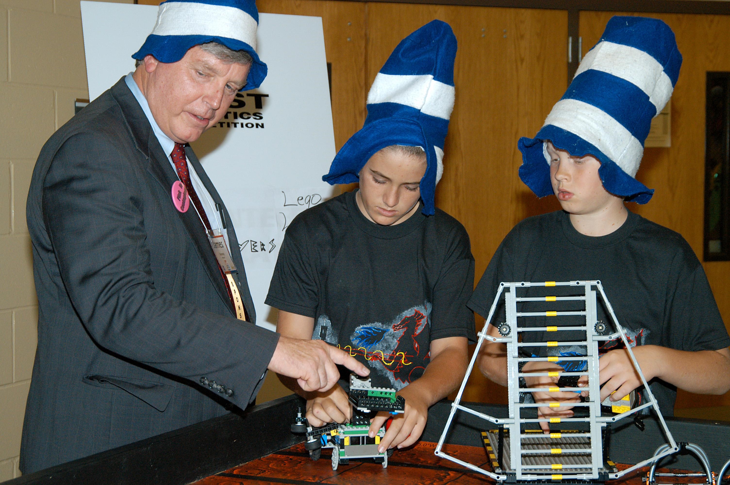 KENNEDY SPACE CENTER, FLA. - While at the 2004 Florida Regional FIRST competition, held at the University of Central Florida, Center Director Jim Kennedy talks to participants in the FIRST LEGO™ League (FLL). Considered the "little league" of the FIRST (For Inspiration and Recognition of Science and Technology) Robotics Competition, FLL is the result of a partnership between FIRST and the LEGO™ Company. FLL extends the FIRST concept of inspiring and celebrating science and technology to children aged 9 through 14, using real-world context and hands-on experimentation. Young participants can build a robot and compete in a friendly, FIRST-style robotics event specially designed for their age group.