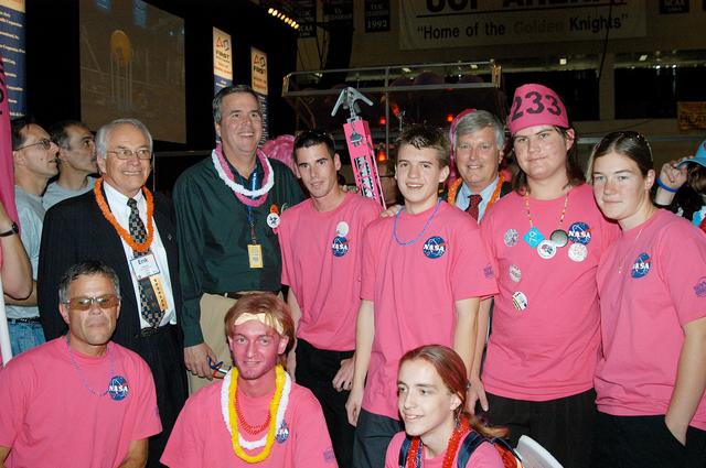 KENNEDY SPACE CENTER, FLA. - The KSC-sponsored “Pink” team poses for a photo with Florida Gov. Jeb Bush (second from left) during a break at the 2004 Florida Regional FIRST competition, held at the University of Central Florida. The annual event is hosting 41 teams from Canada, Brazil, Great Britain and the United States. FIRST is a nonprofit organization, For Inspiration and Recognition of Science and Technology, that sponsors the event pitting robots against each other in an athletic-style competition. The FIRST robotics competition is designed to provide students with a hands-on, inside look at engineering and other professional careers, pairing high school students with engineer mentors and corporations.