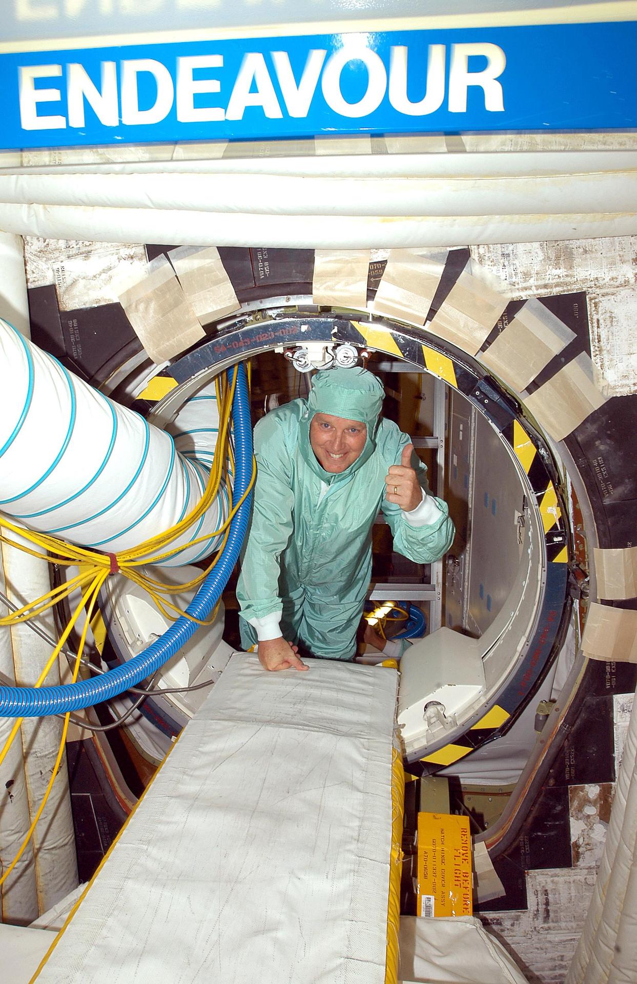 KENNEDY SPACE CENTER, FLA. - Center Director Jim Kennedy is ready to exit Endeavour after watching and talking to workers inside. Kennedy is taking an opportunity to learn first-hand what workers are doing to enable Return to Flight. Endeavour is in an Orbiter Major Modification period.