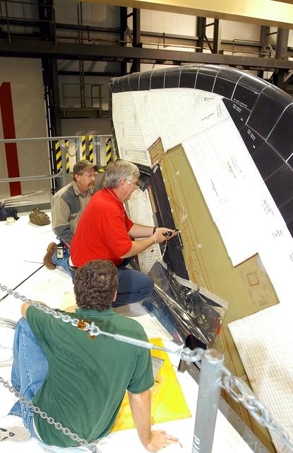 KENNEDY SPACE CENTER, FLA. - Under workers’ watchful eyes in the Orbiter Processing Facility, Center Director Jim Kennedy (center) takes a turn on a screw on Endeavour. Kennedy is taking an opportunity to learn first-hand what workers are doing to enable Return to Flight. Endeavour is in an Orbiter Major Modification period.