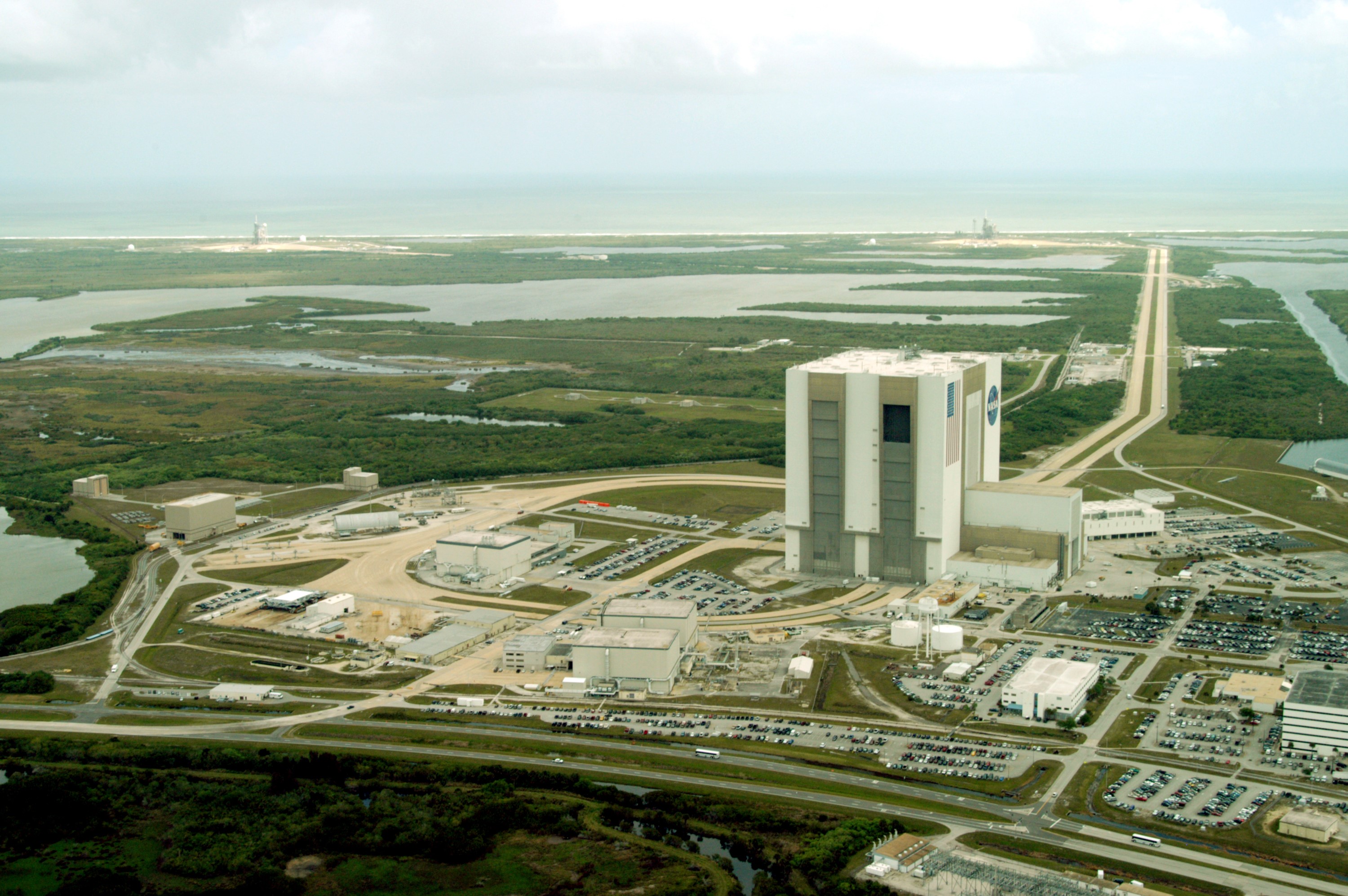 CAPE CANAVERAL, Fla. -- This aerial photo shows the expanse of the Launch Complex 39 Area, bordered at the top by the Atlantic and a cloud-filled sky. At center right, towering above the surrounding sites, is the Vehicle Assembly Building. To the left is the Orbiter Processing Facility's Bay 3. In the foreground are OPF Bays 1 and 2. The two-lane crawlerway stretches from the VAB toward the coast, site of Launch Pad 39A, closest, and Launch Pad 39B, far left. Between the VAB and the ocean sprawl the Banana Creek and the Banana River. Photo credit: NASA