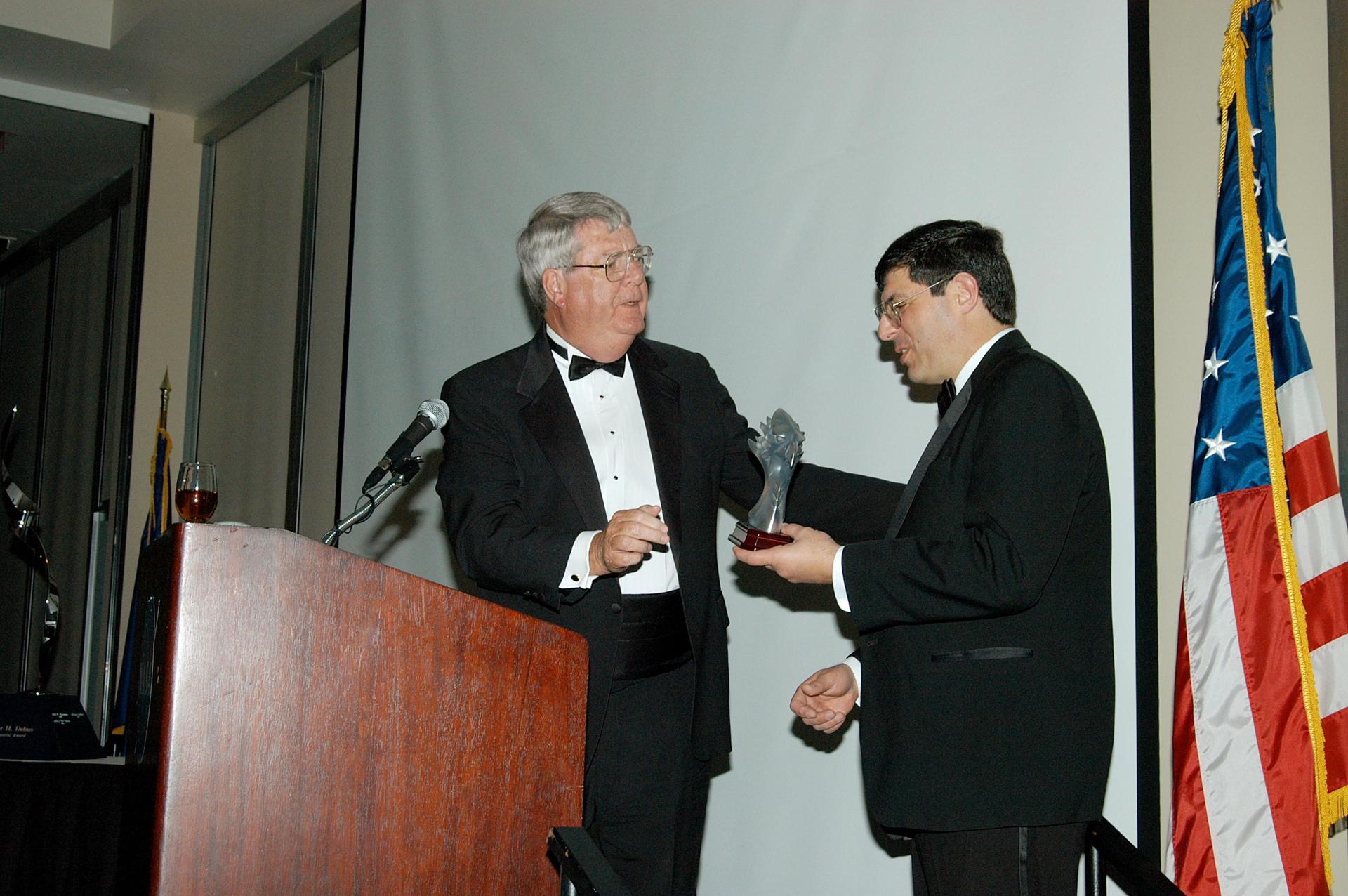 KENNEDY SPACE CENTER, FLA. -- At the annual National Space Club Debus Award Banquet, held at the Dr. Kurt H. Debus Conference Facility in the KSC Visitor Complex, Master of Ceremonies Dick Beagley (left) presents a memento to guest speaker Christopher Scolese, who is the deputy associate administrator in the Office of Space Science at NASA Headquarters. KSC’s Director of the International Space Station/Payloads Processing directorate John J. “Tip” Talone received the Debus award. He was honored for his outstanding personal and professional efforts in supporting the U.S. space program, especially in his current role. Beagley is chairman of the National Space Club Florida Committee, which created the award to recognize significant achievements and contributions made in Florida to American aerospace efforts. It is named for Dr. Kurt H. Debus, first director of KSC, from 1962 to 1974.
