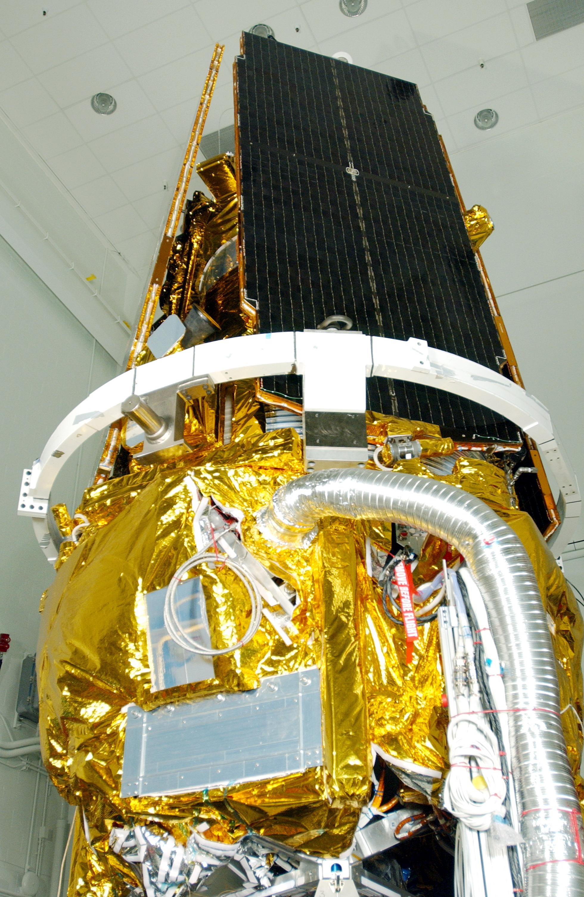 KENNEDY SPACE CENTER, FLA. -- A closeup of the Gravity Probe B spacecraft in NASA’s Payload Processing Facility 1610 on North Vandenberg Air Force Base in California after completion of prelaunch processing before going to the pad. The spacecraft will be transported to Space Launch Complex 2 on April 1 and mated to the Boeing Delta II rocket. Gravity Probe B consists of four sophisticated gyroscopes that will provide an almost perfect space-time reference system. The mission will look in a precise manner for tiny changes in the direction of spin. Gravity Probe B will be launched into a 400-nautical-mile-high polar orbit for a 16-month mission. Launch is scheduled for April 17.