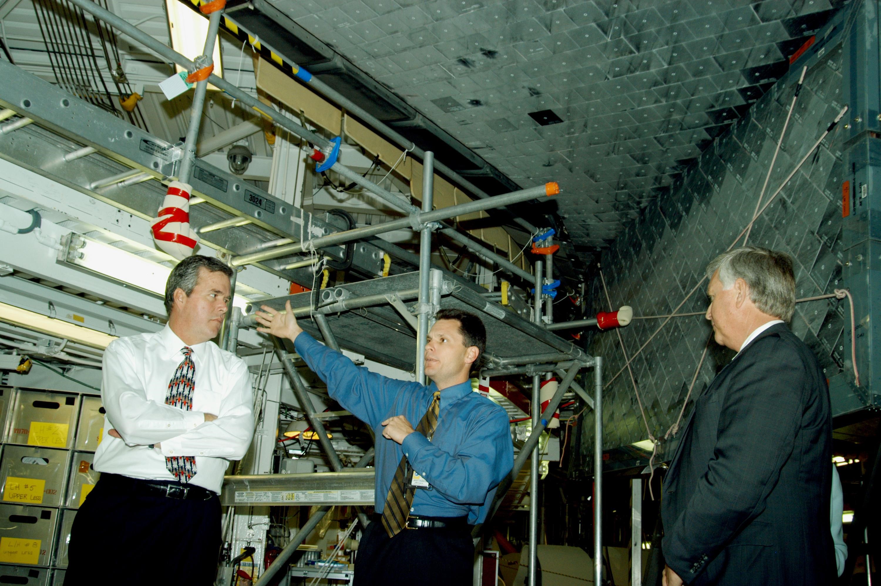 KENNEDY SPACE CENTER, FLA. -- On a tour of the Orbiter Processing Facility, Florida Gov. Jeb Bush (left) listens to NASA Vehicle Manager Scott Thurston talk about the orbiter Atlantis overhead. At right is Center Director Jim Kennedy. The tour followed the launching ceremony at the KSC Visitor Complex for the new Florida quarter issued by the U.S. Mint. The ceremony was emceed by Kennedy and included remarks by NASA Administrator Sean O’Keefe, Bush, U.S. Mint Director Henrietta Holsman Fore and Deputy Secretary of the Treasury Samuel W. Bodman.
