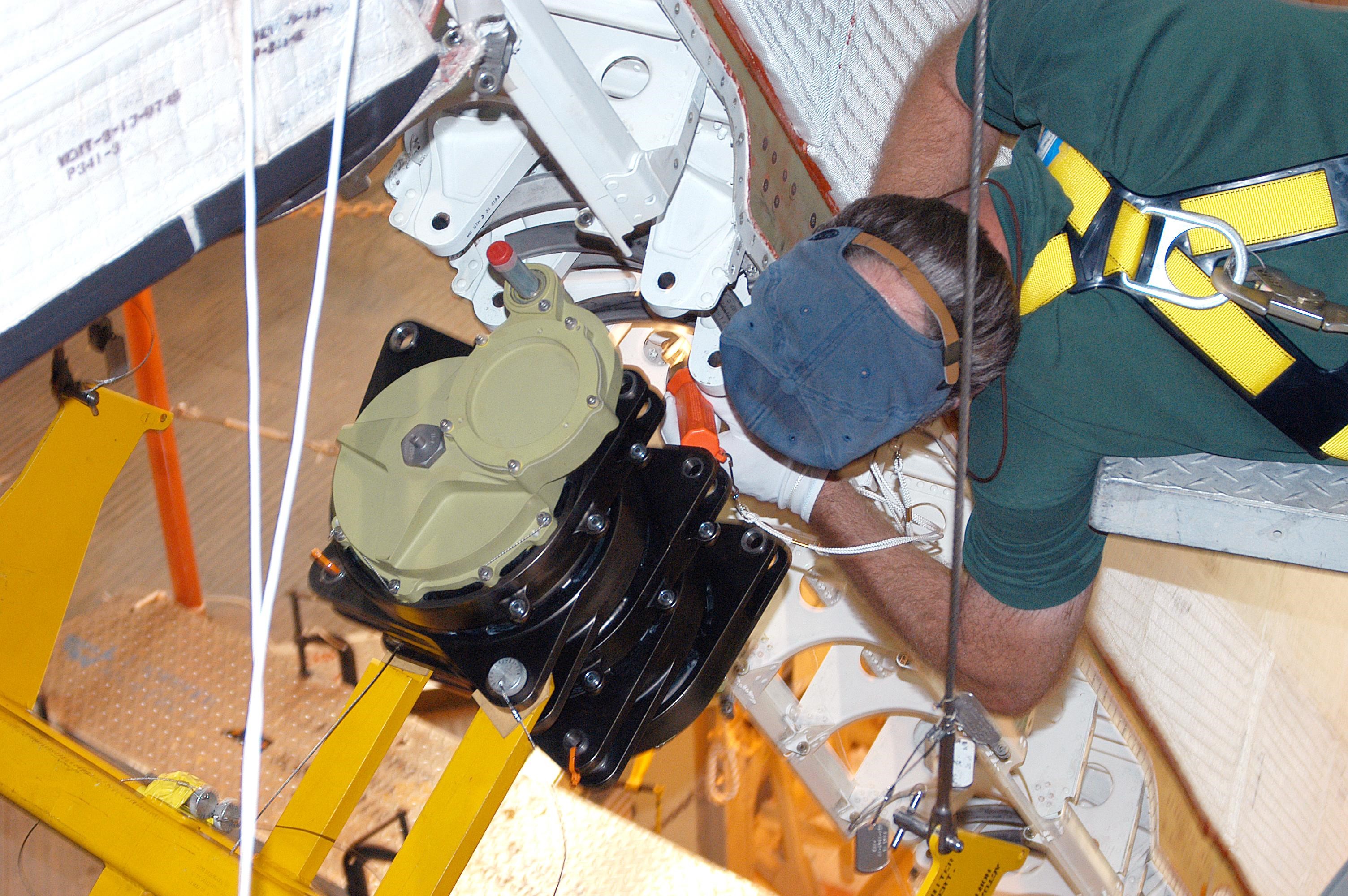 KENNEDY SPACE CENTER, FLA. - A NASA quality inspector checks the placement of Rudder Speed Brake actuator No. 4 as work to install it on Space Shuttle orbiter Discovery nears completion in the Orbiter Processing Facility. Discovery has been assigned to the first Return to Flight mission, STS-114, a logistics flight to the International Space Station.