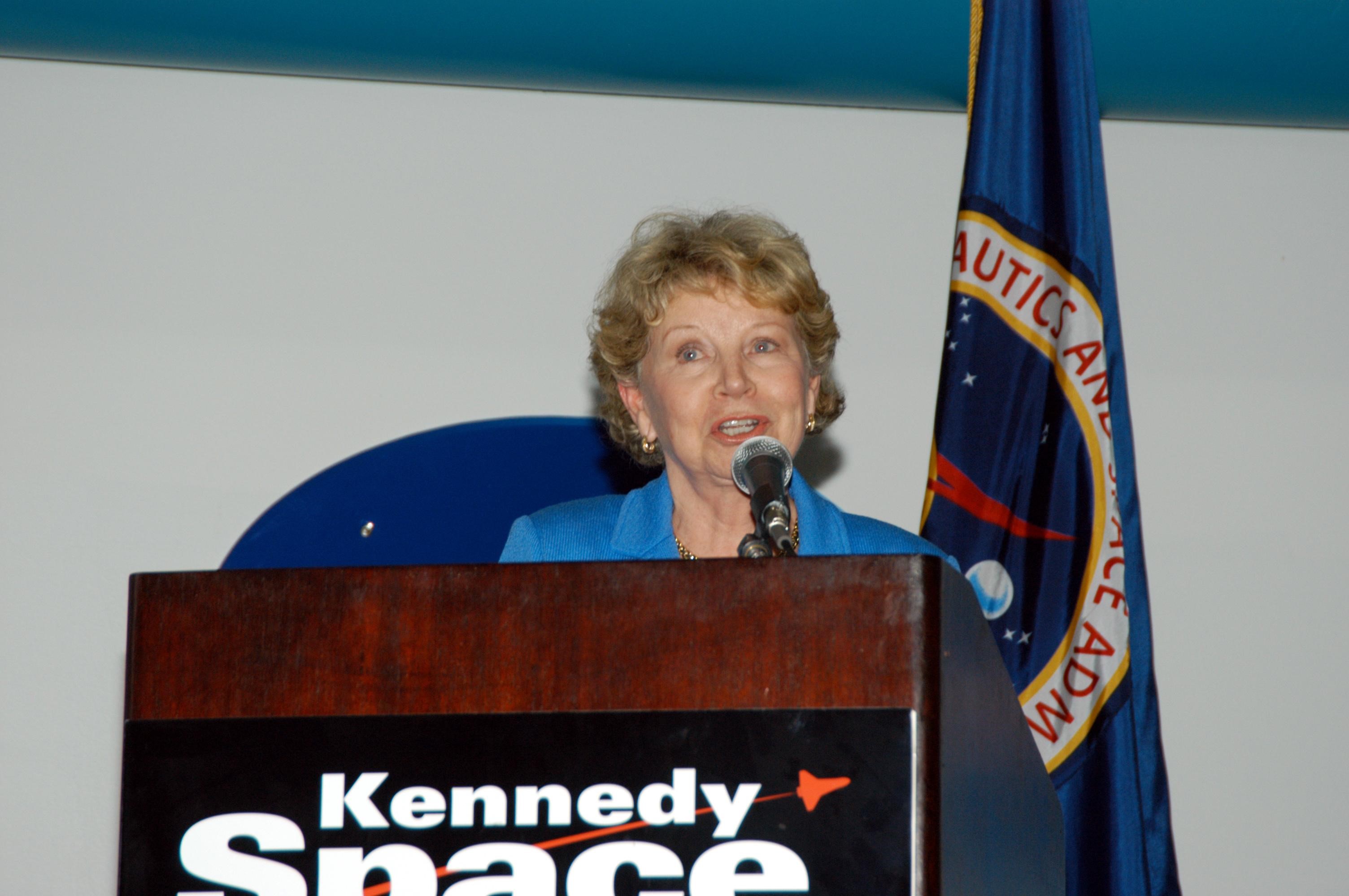 KENNEDY SPACE CENTER, FLA. -- At the Kennedy Space Center Visitor Complex, the late Francis R. "Dick" Scobee, commander of the ill-fated 1986 Challenger mission, is inducted into the U.S. Astronaut Hall of Fame. He is represented by his widow, June Scobee, at the podium. Also chosen for induction in 2004 are Kathryn D. Sullivan, the first American woman to walk in space; Richard O. Covey, commander of the Hubble Space Telescope repair mission; Frederick D. Gregory, the first African-American to command a space mission; and Norman E. Thagard, the first American to occupy Russia's Mir space station. The U.S. Astronaut Hall of Fame opened in 1990 to provide a place where space travelers could be remembered for their participation and accomplishments in the U.S. space program. To be eligible for induction, an individual must have been a U.S. citizen, a NASA astronaut, and out of the active astronaut corps at least five years. The five inductees join 52 previously honored astronauts from the ranks of the Gemini, Apollo, Skylab, Apollo-Soyuz, and Space Shuttle programs.