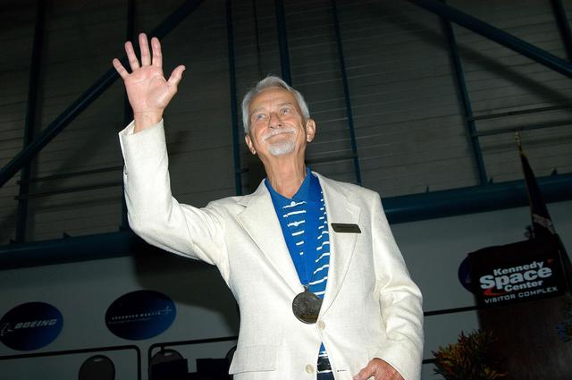 KENNEDY SPACE CENTER, FLA. -- Former astronaut Owen Garriott acknowledges the applause as he is introduced as a previous inductee into the U.S. Astronaut Hall of Fame. He and other Hall of Fame members were present for the induction of five new space program heroes into the U.S. Astronaut Hall of Fame: Richard O. Covey, commander of the Hubble Space Telescope repair mission; Norman E. Thagard, the first American to occupy Russia’s Mir space station; the late Francis R. "Dick" Scobee, commander of the ill-fated 1986 Challenger mission; Kathryn D. Sullivan, the first American woman to walk in space; and Frederick D. Gregory, the first African-American to command a space mission and the current NASA deputy administrator. Garriott exercised his expertise as a solar physicist on two space missions, the 59-day Skylab 3 flight in 1973, and an 11-day trip aboard the Space Shuttle Columbia a decade later. The induction ceremony was held at the Apollo/Saturn V Center at KSC. The U.S. Astronaut Hall of Fame opened in 1990 to provide a place where space travelers could be remembered for their participation and accomplishments in the U.S. space program. The five inductees join 52 previously honored astronauts from the ranks of the Gemini, Apollo, Skylab, Apollo-Soyuz, and Space Shuttle programs.