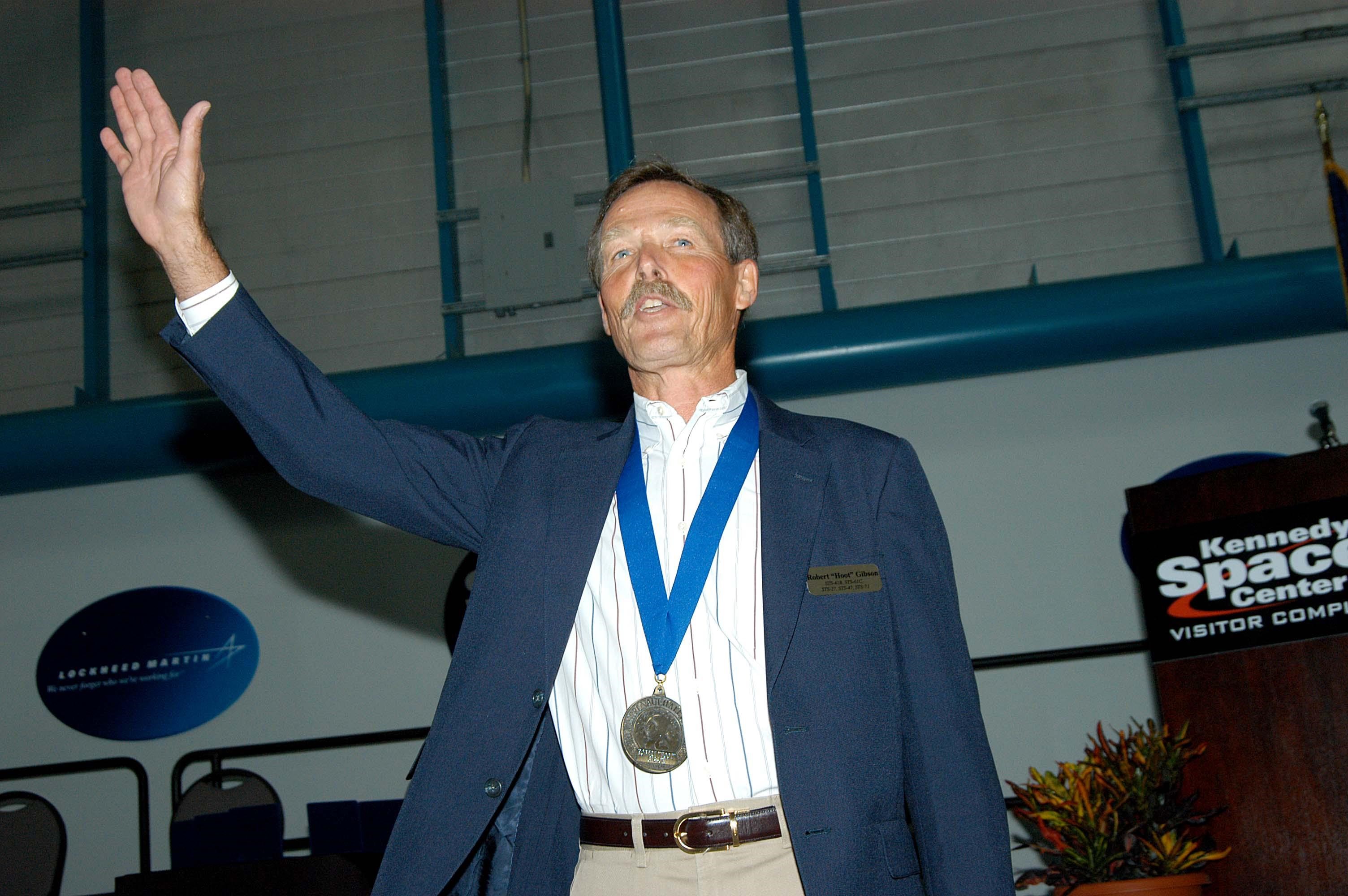 KENNEDY SPACE CENTER, FLA. -- Former astronaut Ed Gibson acknowledges the warm response to his introduction as a previous inductee into the U.S. Astronaut Hall of Fame. He and other Hall of Fame members were present for the induction of five new space program heroes into the U.S. Astronaut Hall of Fame: Richard O. Covey, commander of the Hubble Space Telescope repair mission; Norman E. Thagard, the first American to occupy Russia’s Mir space station; the late Francis R. "Dick" Scobee, commander of the ill-fated 1986 Challenger mission; Kathryn D. Sullivan, the first American woman to walk in space; and Frederick D. Gregory, the first African-American to command a space mission and the current NASA deputy administrator. Gibson orbited the Earth for 84 days during the final manned flight of the Skylab Space Station in 1973 and 1974. The induction ceremony was held at the Apollo/Saturn V Center at KSC. The U.S. Astronaut Hall of Fame opened in 1990 to provide a place where space travelers could be remembered for their participation and accomplishments in the U.S. space program. The five inductees join 52 previously honored astronauts from the ranks of the Gemini, Apollo, Skylab, Apollo-Soyuz, and Space Shuttle programs.