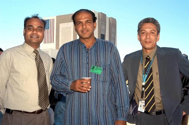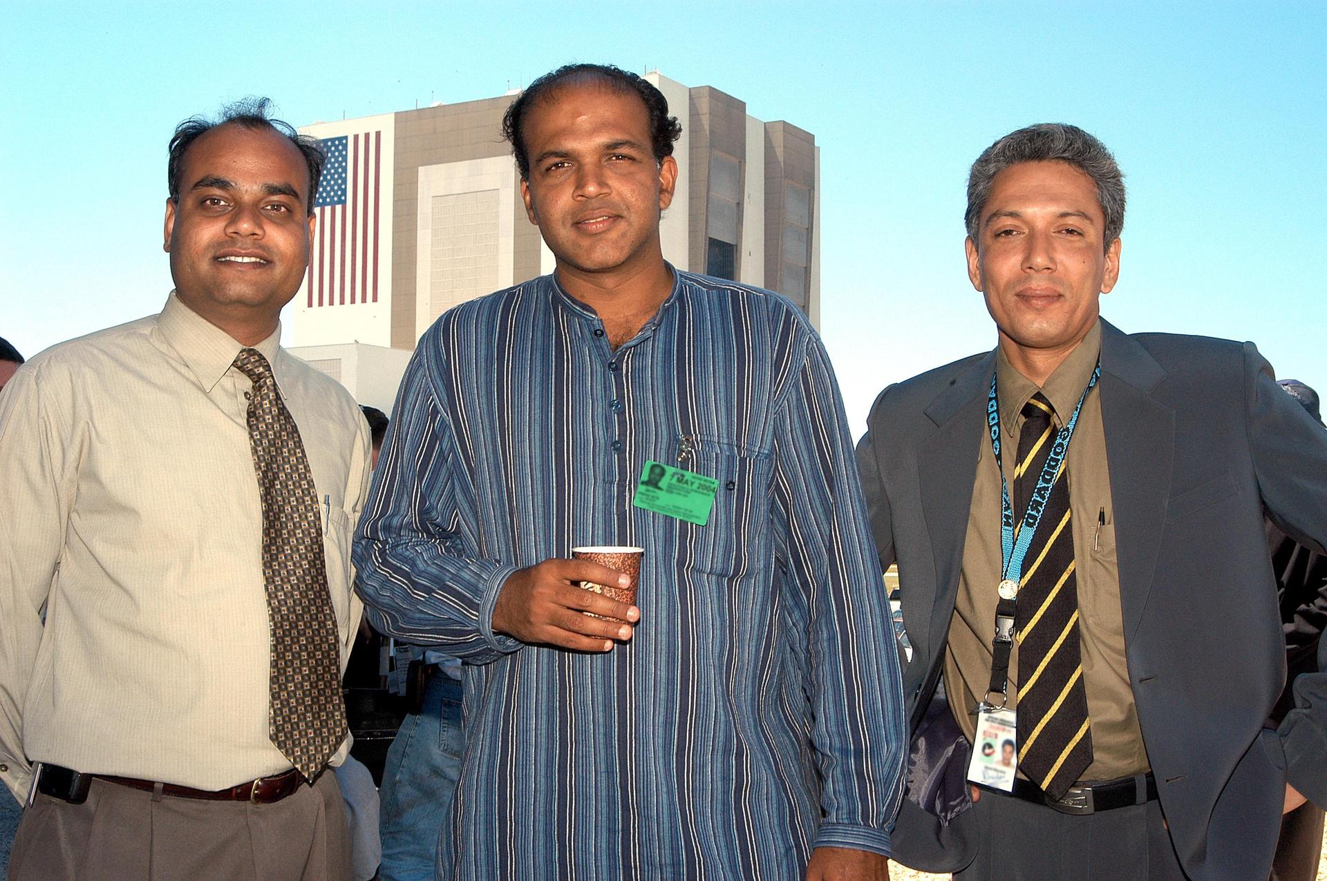 KENNEDY SPACE CENTER, FLA. -- During filming at KSC, Shirish R. Patel (left, with KSC’s International Space Station Payload Processing) joins the writer-director Ashutosh Gowariker and actor Rahul Vohra for a photo. The film crew from India spent several days at KSC filming at various sites for the movie “Swades,” a story about India’s brain-drain. The lead actors are Shahrukh Khan and Gayatri Joshi. Sunita Gowariker is executive producer.