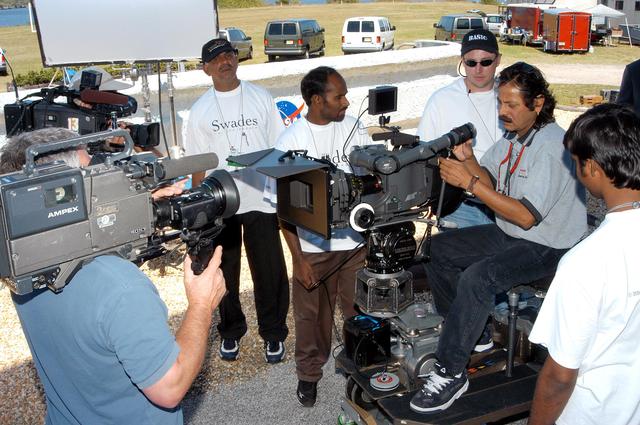 KENNEDY SPACE CENTER, FLA. -- A film crew from India sets up equipment at the viewing stands near the NASA News Center. Behind the camera at right is Director of Photography Mahesh Aney. The crew spent several days at KSC filming at various sites for the movie “Swades,” a story about India’s brain-drain. The writer and director is Ashutosh Gowariker. The lead actors are Shahrukh Khan and Gayatri Joshi. Sunita Gowariker is executive producer.