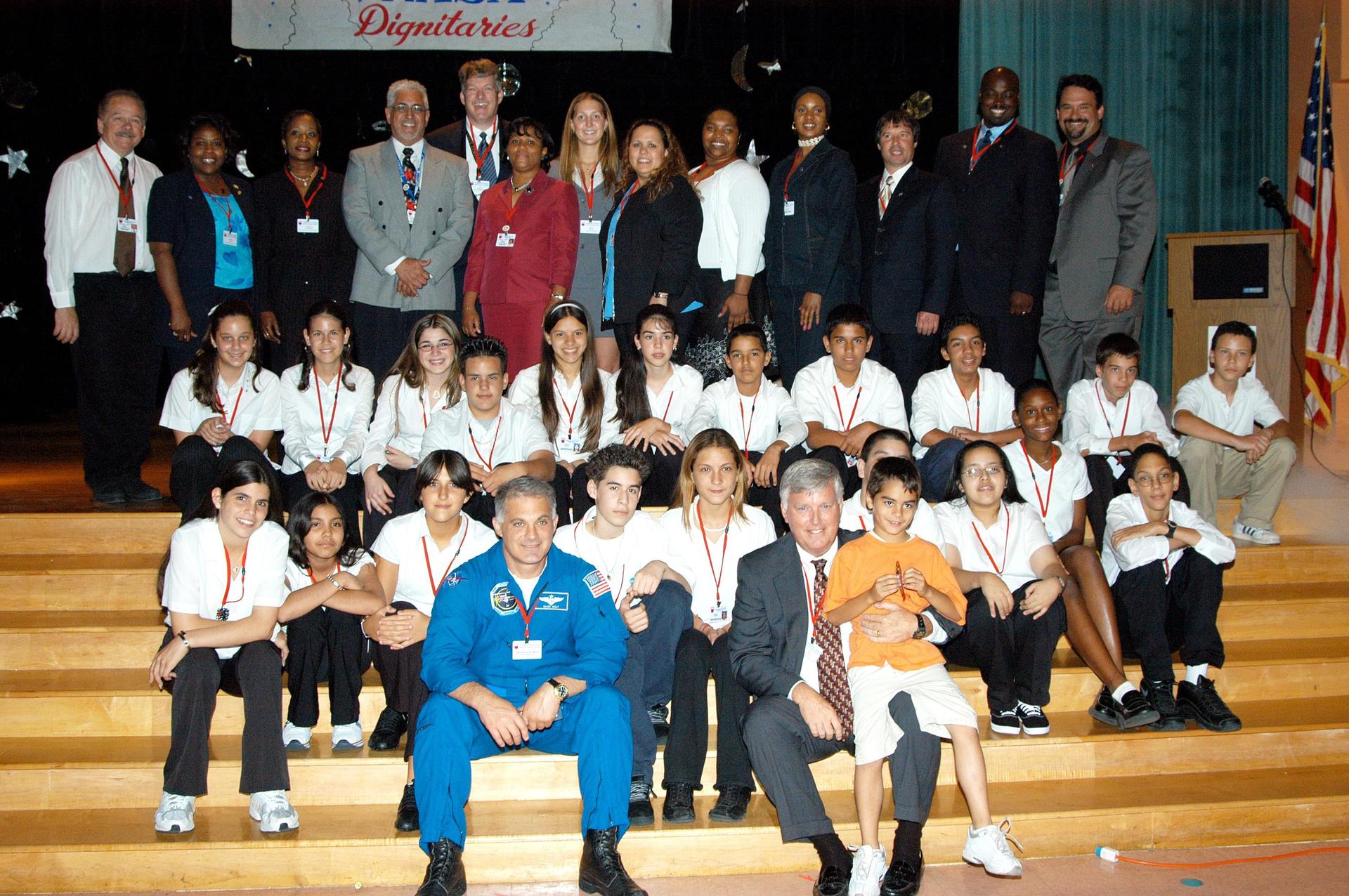 KENNEDY SPACE CENTER, FLA. -- Astronaut David Wolf (left) and Center Director Jim Kennedy (right, with boy) pose for a photo with students and faculty in Howard A. Doolin Middle School, Miami, Fla., plus other NASA and KSC representatives (rear). The school is one of 100 taking part in the NASA Explorer Schools (NES) program. The purpose of Kennedy’s visit is to share America’s new vision for space exploration with the next generation of explorers. He is talking with students in Florida and Georgia Explorer Schools about our destiny as explorers, NASA’s stepping stone approach to exploring Earth, the Moon, Mars and beyond, how space impacts our lives, and how people and machines rely on each other in space.