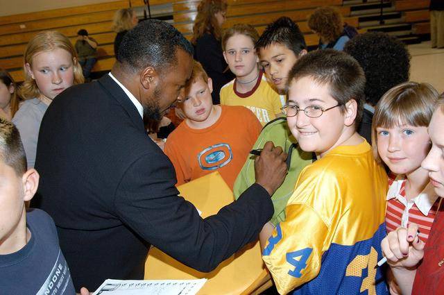 KENNEDY SPACE CENTER, FLA. -- KSC Deputy Director Dr. Woodrow Whitlow signs autographs for students at Trojan Intermediate School in Potosi, Mo. Students from three area schools — Potosi High School, John Evans Middle School and Trojan — are on a team taking part in NASA’s Explorer Schools program. Whitlow visited the school to share America’s new vision for space exploration with the next generation of explorers. He is talking with students about our destiny as explorers, NASA’s stepping stone approach to exploring Earth, the Moon, Mars and beyond, how space impacts our lives, and how people and machines rely on each other in space.