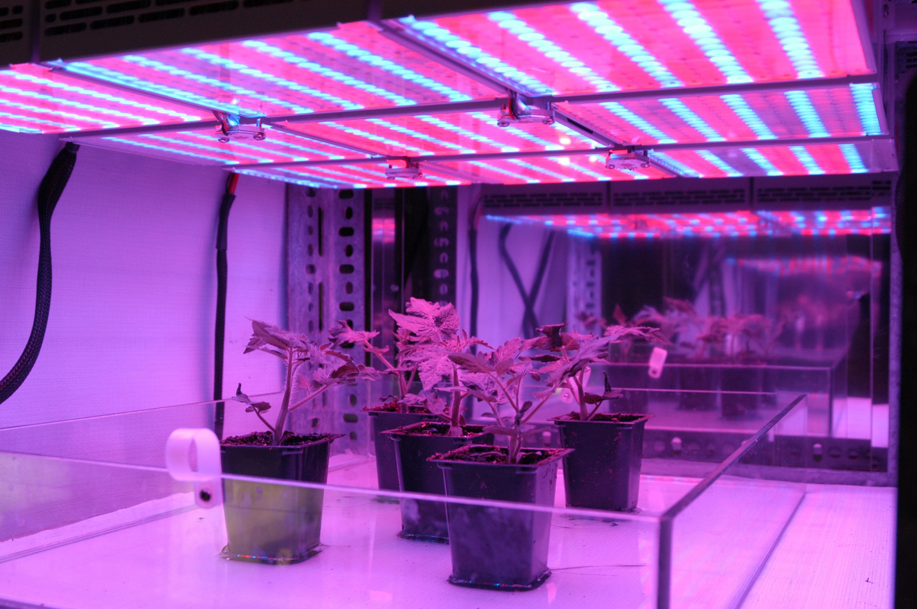 KENNEDY SPACE CENTER, FLA. - In the KSC Space Life Sciences Lab, Arabidopsis plants appear purple under red and green light as part of research on growth under various light conditions. Other plant research includes different CO2 concentrations and temperatures. The Lab is exploring various aspects of a bioregenerative life support system. Such research and technology development will be crucial to long-term habitation of space by humans.