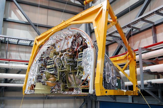 KENNEDY SPACE CENTER, FLA. - In the Orbiter Processing Facility, the Forward Reaction Control System (FRCS) is lifted by an overhead crane for installation in Discovery. Located in the forward fuselage nose area, the FRCS provides the thrust for attitude (rotational) maneuvers (pitch, yaw and roll) and for small velocity changes along the orbiter axis (translation maneuvers). Discovery is designated as the Return to Flight vehicle for mission STS-114, no earlier than March 2005.