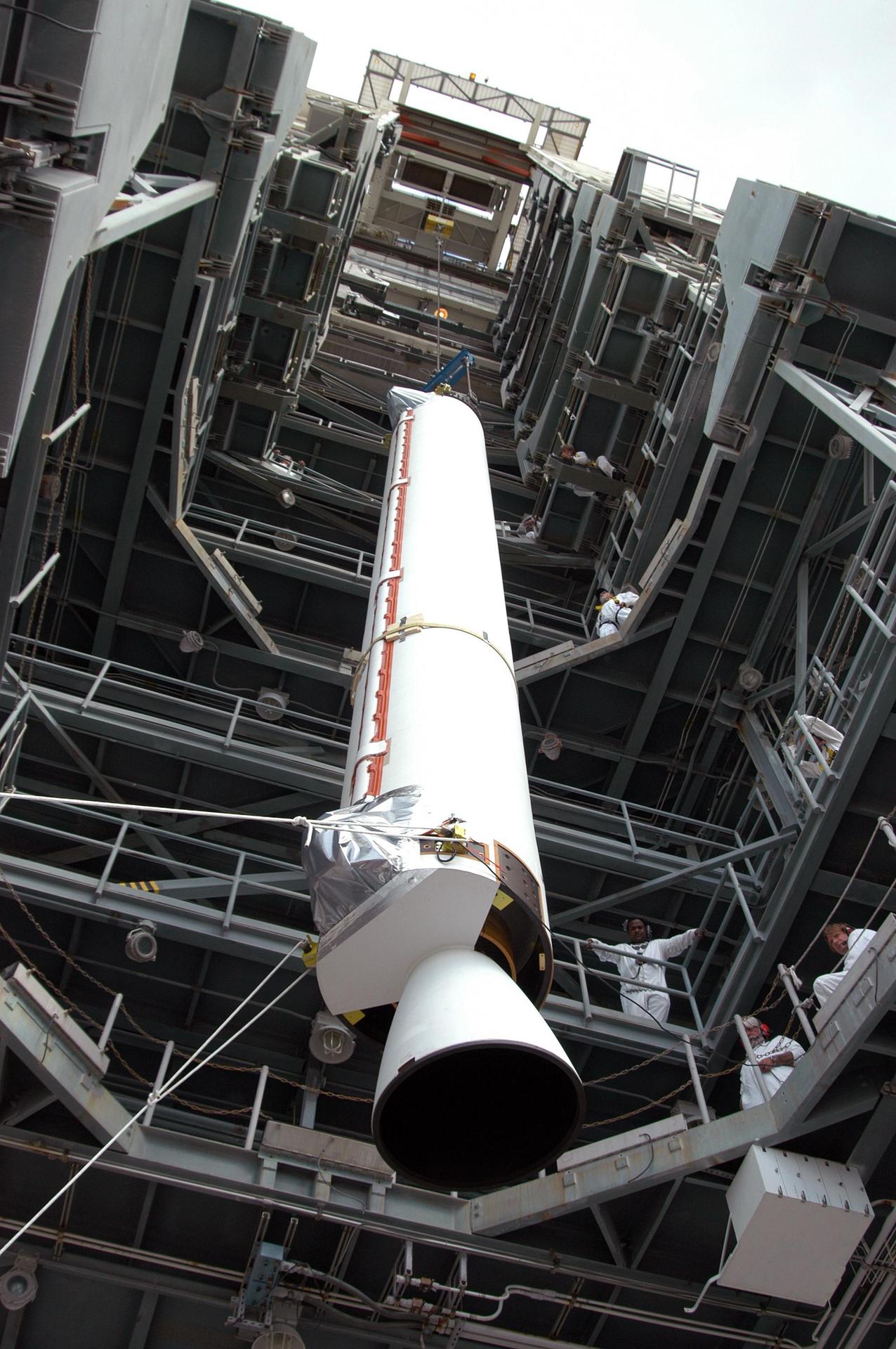 KENNEDY SPACE CENTER, FLA. - The first Solid Rocket Booster (SRB) for the MESSENGER spacecraft launch is lifted up the mobile service tower at Pad 17-B, Cape Canaveral Air Force Station. The SRB will be mated to the Boeing Delta II Heavy rocket for the Aug. 2 launch to the planet Mercury. The spacecraft is expected to reach orbit around Mercury in March 2011. MESSENGER was built for NASA by the Johns Hopkins University Applied Physics Laboratory in Laurel, Md.