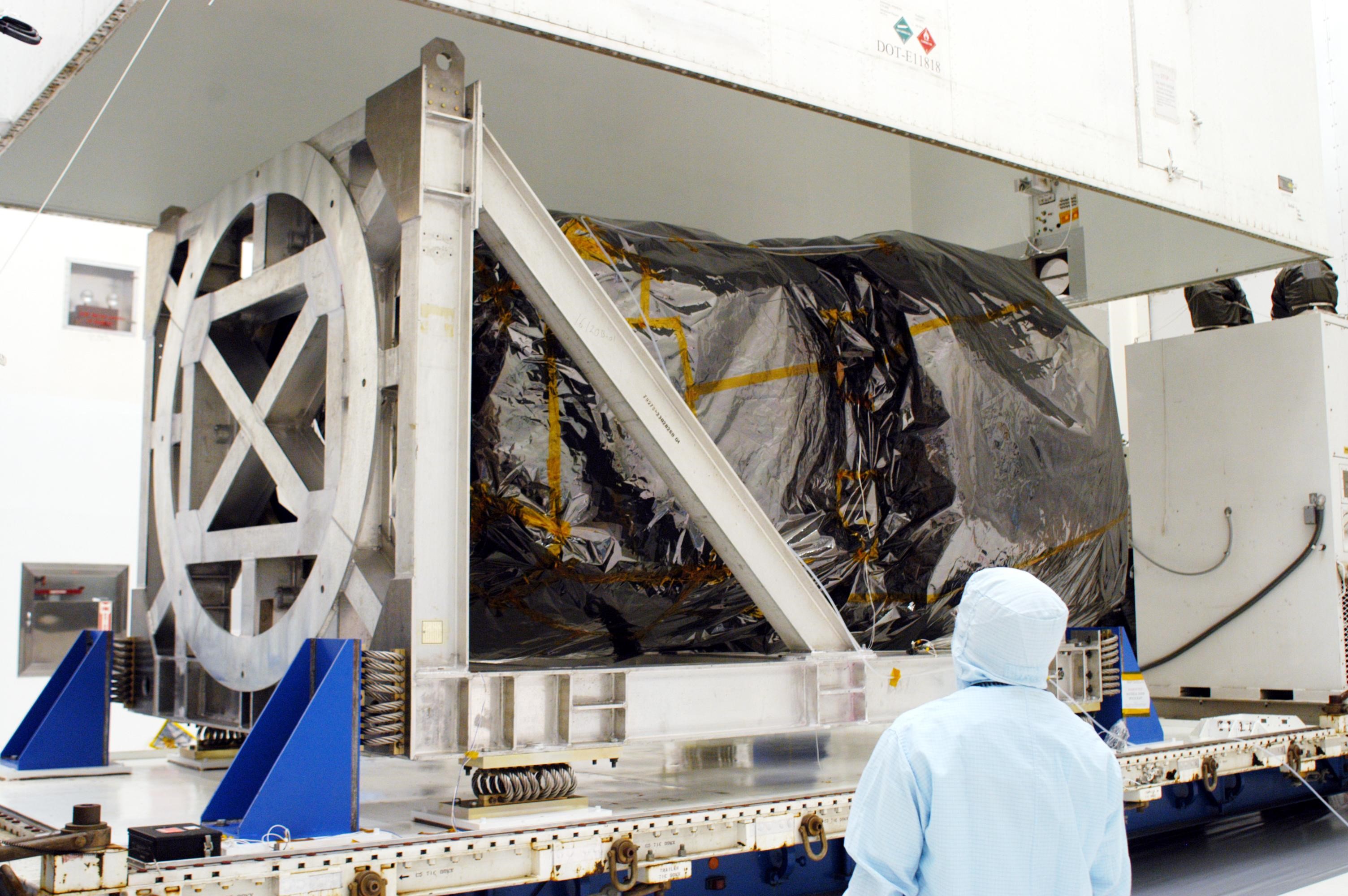 KENNEDY SPACE CENTER, FLA. - Inside Hangar AE at Cape Canaveral Air Force Station (CCAFS), workers observe the canister being lifted from the Swift spacecraft, which is enclosed in a protective cover. Swift is a first-of-its-kind, multi-wavelength observatory dedicated to the study of gamma-ray burst (GRB) science. Its three instruments will work together to observe GRBs and afterglows in the gamma-ray, X-ray and optical wavebands. Swift is part of NASA’s medium explorer (MIDEX) program being developed by an international collaboration. It will be launched no earlier than Oct. 7 into a low-Earth orbit on a Boeing Delta 7320 rocket from pad 17-A at CCAFS. During its nominal 2-year mission, Swift is expected to observe more than 200 bursts, which will represent the most comprehensive study of GRB afterglow to date.
