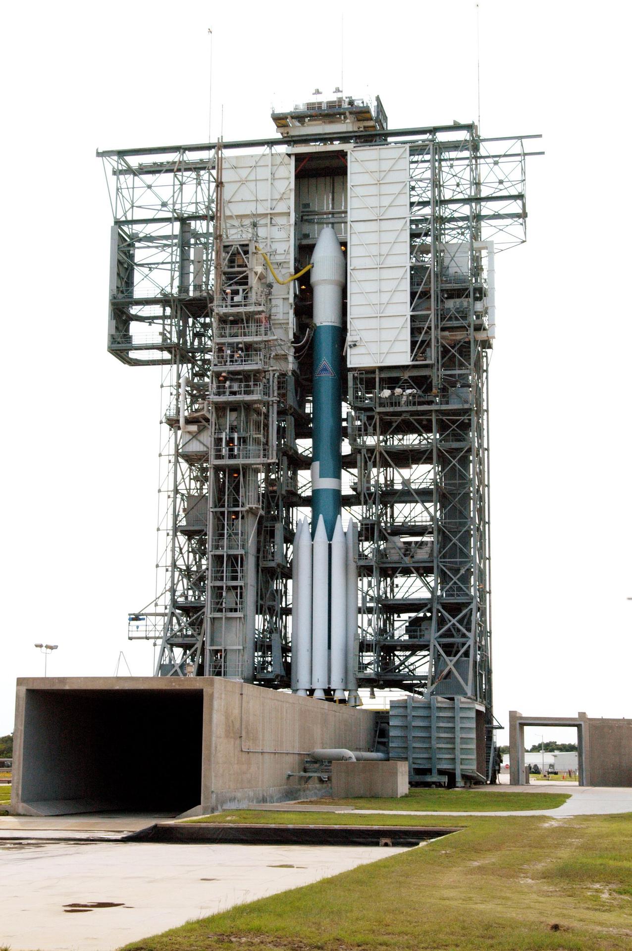 KENNEDY SPACE CENTER, FLA. - On Launch Pad 17-B, Cape Canaveral Air Force Station, the Boeing Delta II rocket with the Mercury Surface, Space Environment, Geochemistry and Ranging (MESSENGER) spacecraft aboard waits for rollback of the mobile service tower and a second launch attempt in two days. The first attempt Aug. 2 was postponed due to lightning potential from residual clouds that were associated with Tropical Storm Alex. The launch of MESSENGER on a seven-year journey to the planet Mercury is rescheduled for this date at 2:15:56 a.m. EDT at the opening of a 12-second launch window. MESSENGER will fly by Earth, Venus and Mercury several times to burn off energy before making its final approach to the inner planet on March 18, 2011. MESSENGER was built for NASA by the Johns Hopkins University Applied Physics Laboratory in Laurel, Md.
