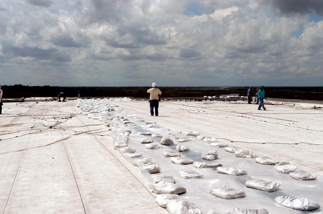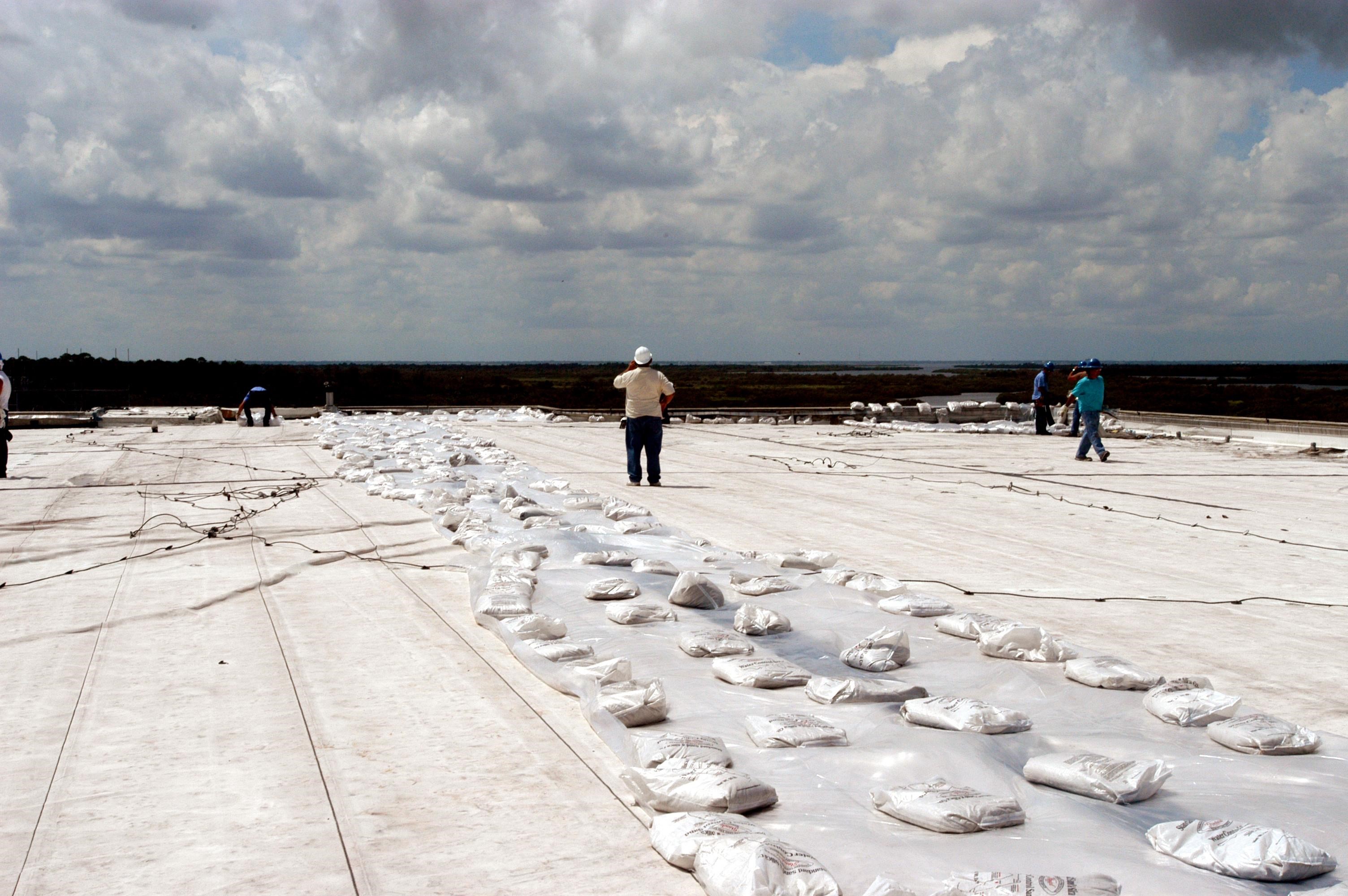 KENNEDY SPACE CENTER, FLA. - The work to clean up and secure the roof of the Processing Control Center which sustained damage from Hurricane Frances is under way. The storm's path over Florida took it through Cape Canaveral and KSC property during Labor Day weekend. Located in Launch Complex 39, the facility houses some of the staff and computers responsible for Launch Processing System (LPS) software development, launch team training, and LPS maintenance.