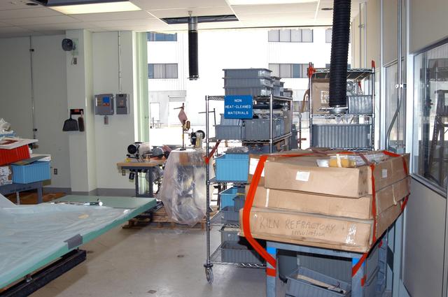 KENNEDY SPACE CENTER, FLA. - Equipment from the Thermal Protection System Facility (TPSF), damaged by Hurricane Frances, is moved into a hangar and storage facility near the KSC Shuttle Landing Facility. Previously, this hangar was used to house the Space Shuttle Columbia debris. Located in Launch Complex 39, the TPSF is used to manufacture both internal and external insulation products for the Space Shuttle orbiters. The storm's path over Florida took it through Cape Canaveral and KSC property during Labor Day weekend.