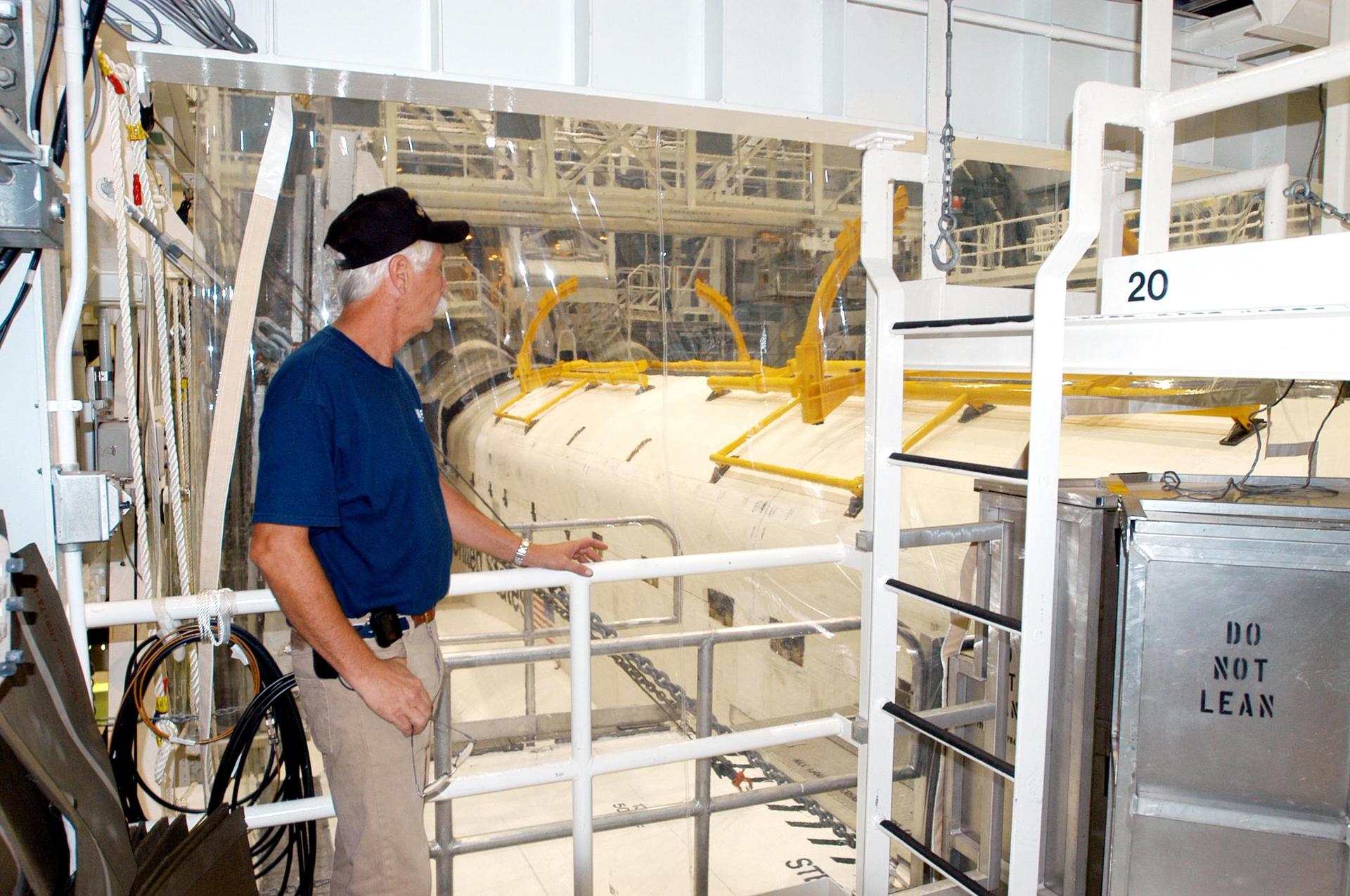 KENNEDY SPACE CENTER, FLA. - United Space Alliance employee Terry White surveys Space Shuttle Atlantis in the Orbiter Processing Facility following Hurricane Frances. The storm's path over Florida took it through Cape Canaveral and KSC property during Labor Day weekend. There was no damage to the Space Shuttle orbiters or to any other flight hardware.