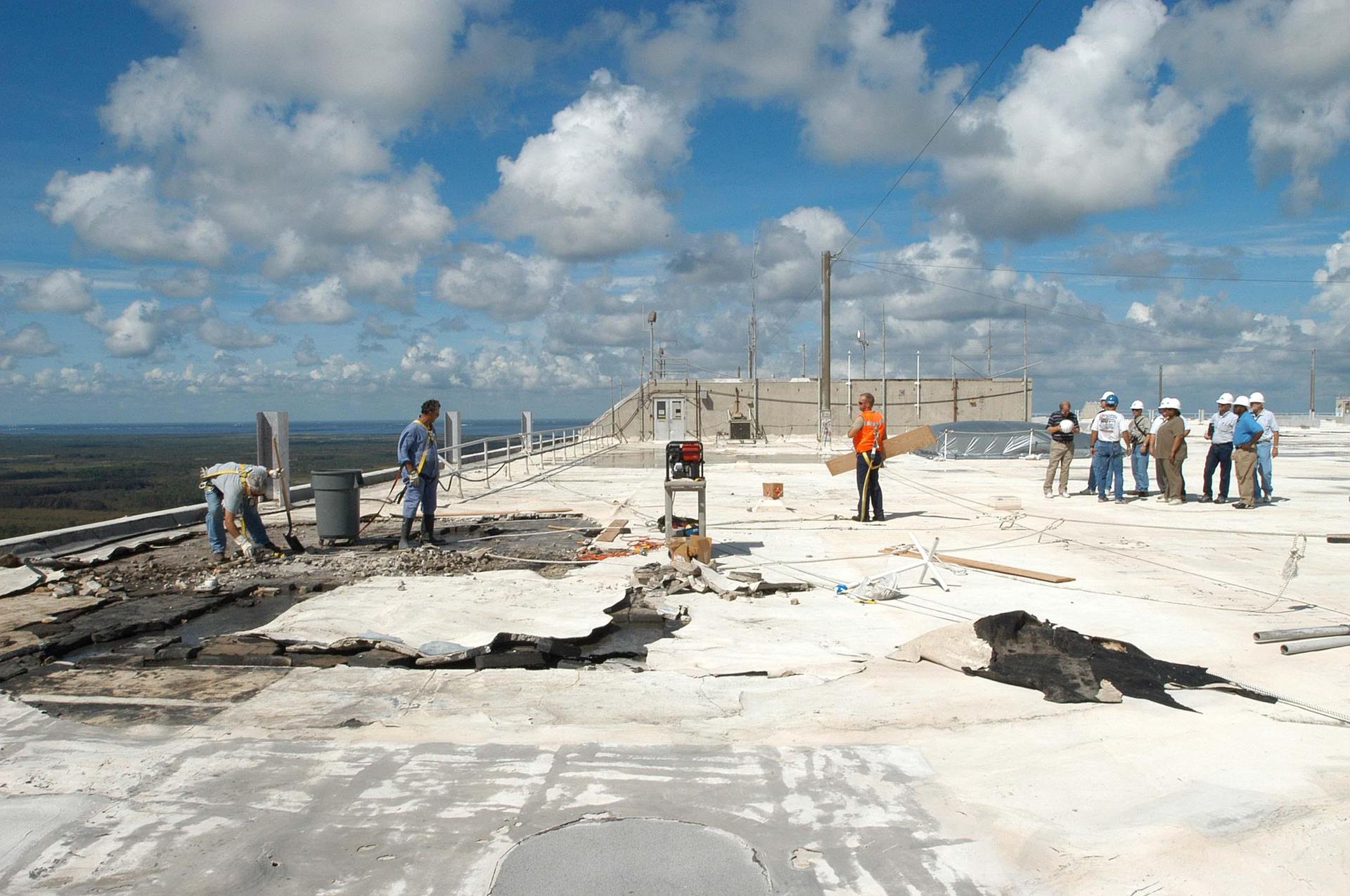 KENNEDY SPACE CENTER, FLA. - Members of a hurricane assessment team from Johnson Space Center and Marshall Space Flight Center look at damage on the roof of the Vehicle Assembly Building (VAB) a week after Hurricane Frances hit the east coast of Central Florida and Kennedy Space Center. The VAB lost 820, 4- x 16-foot panels from the side walls, or more than 52,000 square feet of its surface.