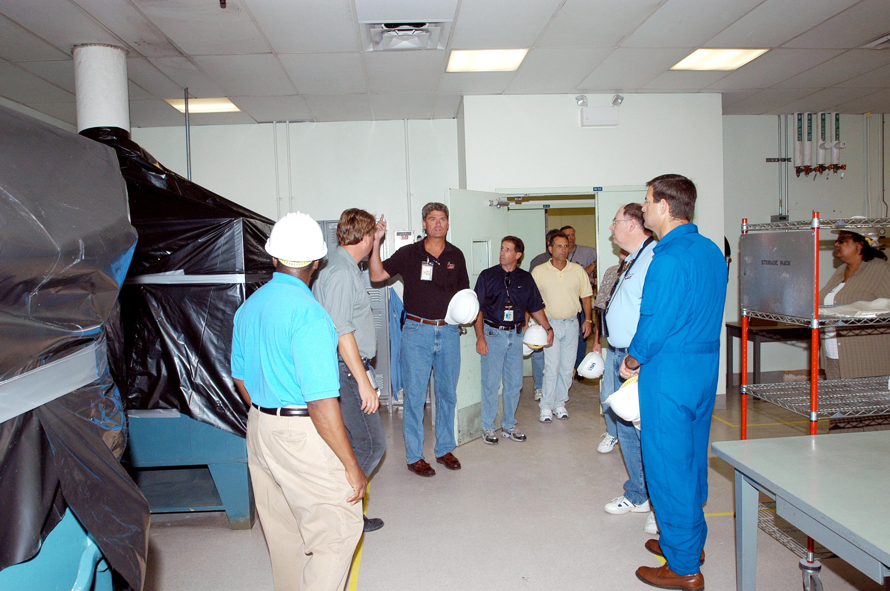KENNEDY SPACE CENTER, FLA. - Members of a hurricane assessment team from Johnson Space Center and Marshall Space Flight Center tour the Thermal Protection System (TPS) Facility at KSC after Hurricane Frances hit the east coast of Central Florida and Kennedy Space Center. At right is astronaut Scott Altmann, a member of the team. The facility, which creates the TPS tiles, blankets and all the internal thermal control systems for the Space Shuttles, is almost totally unserviceable at this time after losing approximately 35 percent of its roof. Equipment and materials that survived the storm have been relocated to the RLV hangar near the KSC Shuttle Landing Facility.