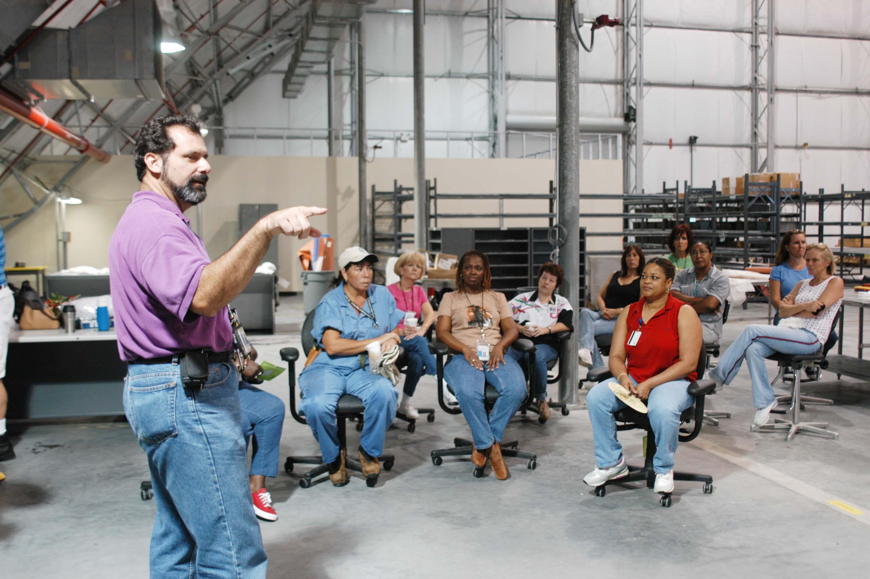 KENNEDY SPACE CENTER, FLA. - In the RLV hangar at KSC, Steve Harrington talks to workers about the equipment removed from the hurricane-ravaged Thermal Protection System Facility (TPSF) now being stored in the hangar. The facility, which creates the TPS tiles, blankets and all the internal thermal control systems for the Space Shuttles, is almost totally unserviceable at this time after losing approximately 35 percent of its roof due to Hurricane Frances, which blew across Central Florida Sept. 4-5. The maximum wind at the surface from Hurricane Frances was 94 mph from the northeast at 6:40 a.m. on Sunday, September 5. It was recorded at a weather tower located on the east shore of the Mosquito Lagoon near the Cape Canaveral National Seashore. The highest sustained wind at KSC was 68 mph.