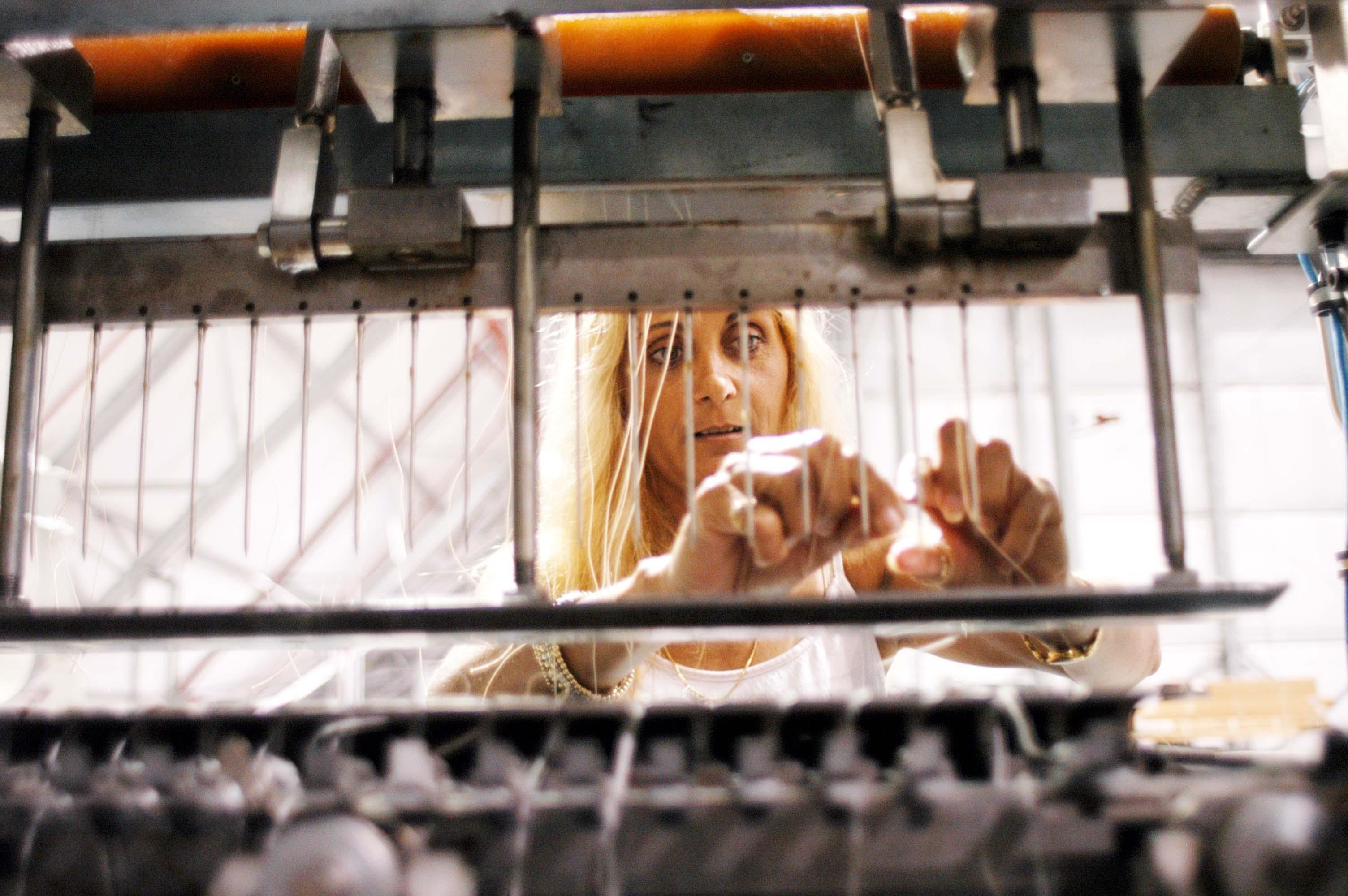KENNEDY SPACE CENTER, FLA. - United Space Alliance worker Bab Jarosz works with the 30-needle sewing machines from the Thermal Protection System Facility (TPSF). A temporary tile shop has been set up in the RLV hangar at KSC after equipment was removed from the hurricane-ravaged facility. The TPSF, which creates the TPS tiles, blankets and all the internal thermal control systems for the Space Shuttles, is almost totally unserviceable at this time after losing approximately 35 percent of its roof due to Hurricane Frances, which blew across Central Florida Sept. 4-5. The maximum wind at the surface from Hurricane Frances was 94 mph from the northeast at 6:40 a.m. on Sunday, September 5. It was recorded at a weather tower located on the east shore of the Mosquito Lagoon near the Cape Canaveral National Seashore. The highest sustained wind at KSC was 68 mph.