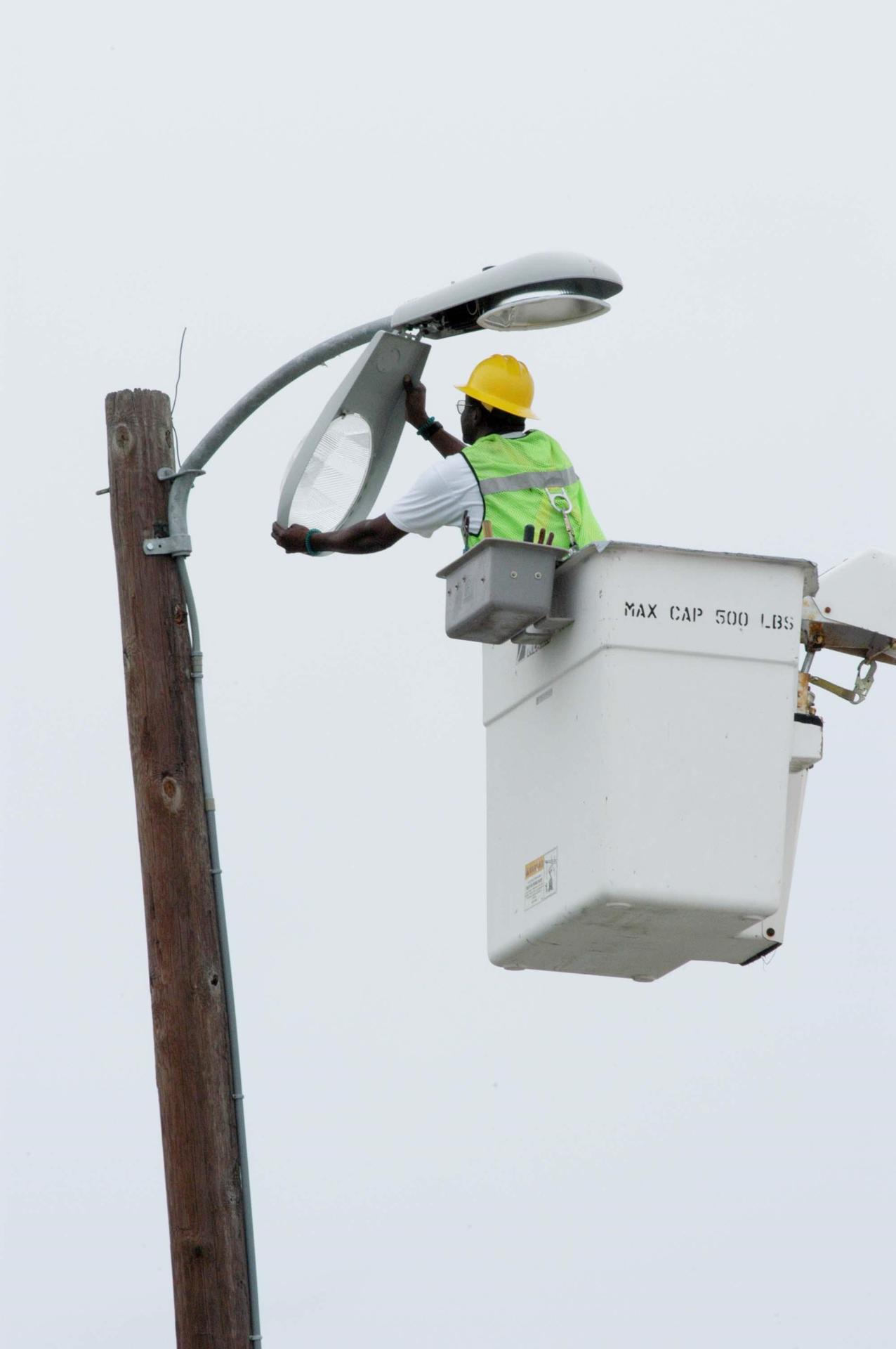 KENNEDY SPACE CENTER, FLA. - A repair crew replaces a light fixture damaged by Hurricane Frances as it passed over Central Florida during the Labor Day weekend. The maximum wind at the surface from Hurricane Frances was 94 mph from the northeast at 6:40 a.m. on Sunday, September 5. It was recorded at a weather tower located on the east shore of the Mosquito Lagoon near the Cape Canaveral National Seashore. The highest sustained wind at KSC was 68 mph. KSC sustained damage to the south wall and roof of the Vehicle Assembly Building plus the roof of the Thermal Protection System Facility.