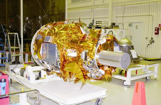 KENNEDY SPACE CENTER, FLA. - At Vandenberg Air Force Base in California, the Demonstration of Autonomous Rendezvous Technology (DART) spacecraft is ready for mating with the upper stage of the Orbital Sciences Pegasus XL behind it (right). DART was designed and built for NASA by Orbital Sciences Corporation as an advanced flight demonstrator to locate and maneuver near an orbiting satellite. DART weighs about 800 pounds and is nearly 6 feet long and 3 feet in diameter. The Pegasus XL will launch DART into a circular polar orbit of approximately 475 miles. DART is designed to demonstrate technologies required for a spacecraft to locate and rendezvous, or maneuver close to, other craft in space. Results from the DART mission will aid in the development of NASA’s Crew Exploration Vehicle and will also assist in vehicle development for crew transfer and crew rescue capability to and from the International Space Station.