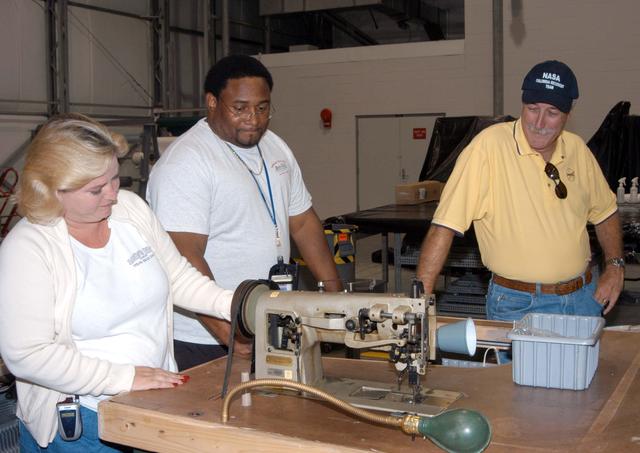 KENNEDY SPACE CENTER, FLA. - - NASA Administrator Sean O’Keefe (right) looks at equipment moved from the Thermal Protection System Facility to the RLV Hangar. At left are United Space Alliance technicians Shelly Kipp and Eric Moss. O’Keefe and NASA Associate Administrator of Space Operations Mission Directorate William Readdy are visiting KSC to survey the damage sustained by KSC facilities from Hurricane Frances. The Thermal Protection System Facility (TPSF), which creates the TPS tiles, blankets and all the internal thermal control systems for the Space Shuttles, is almost totally unserviceable at this time after losing approximately 35 percent of its roof in the storm, which blew across Central Florida Sept. 4-5. Undamaged equipment was removed from the TPSF and stored in the hangar. The Labor Day storm also caused significant damage to the Vehicle Assembly Building and Processing Control Center. Additionally, the Operations and Checkout Building, Vertical Processing Facility, Hangar AE, Hangar S and Hangar AF Small Parts Facility each received substantial damage. However, well-protected and unharmed were NASA’s three Space Shuttle orbiters - Discovery, Atlantis and Endeavour - along with the Shuttle launch pads, all of the critical flight hardware for the orbiters and the International Space Station, and NASA’s Swift spacecraft that is awaiting launch in October.