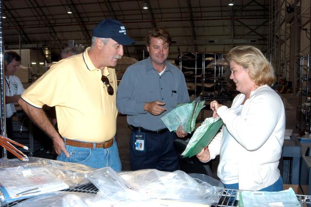 KENNEDY SPACE CENTER, FLA. - - United Space Alliance technician Shelly Kipp (right) shows some of the material salvaged from the storm-ravaged Thermal Protection System Facility (TPSF) to NASA Administrator Sean O’Keefe (left). Martin Wilson (center), manager of TPS operations for USA, looks on. The TPSF, which creates the TPS tiles, blankets and all the internal thermal control systems for the Space Shuttles, is almost totally unserviceable at this time after losing approximately 35 percent of its roof during Hurricane Frances, which blew across Central Florida Sept. 4-5. O’Keefe and NASA Associate Administrator of Space Operations Mission Directorate William Readdy are visiting KSC to survey the damage sustained by KSC facilities from the hurricane. Undamaged equipment was removed from the TPSF and stored in the RLV hangar. The Labor Day storm also caused significant damage to the Vehicle Assembly Building and Processing Control Center. Additionally, the Operations and Checkout Building, Vertical Processing Facility, Hangar AE, Hangar S and Hangar AF Small Parts Facility each received substantial damage. However, well-protected and unharmed were NASA’s three Space Shuttle orbiters -- Discovery, Atlantis and Endeavour - along with the Shuttle launch pads, all of the critical flight hardware for the orbiters and the International Space Station, and NASA’s Swift spacecraft that is awaiting launch in October.
