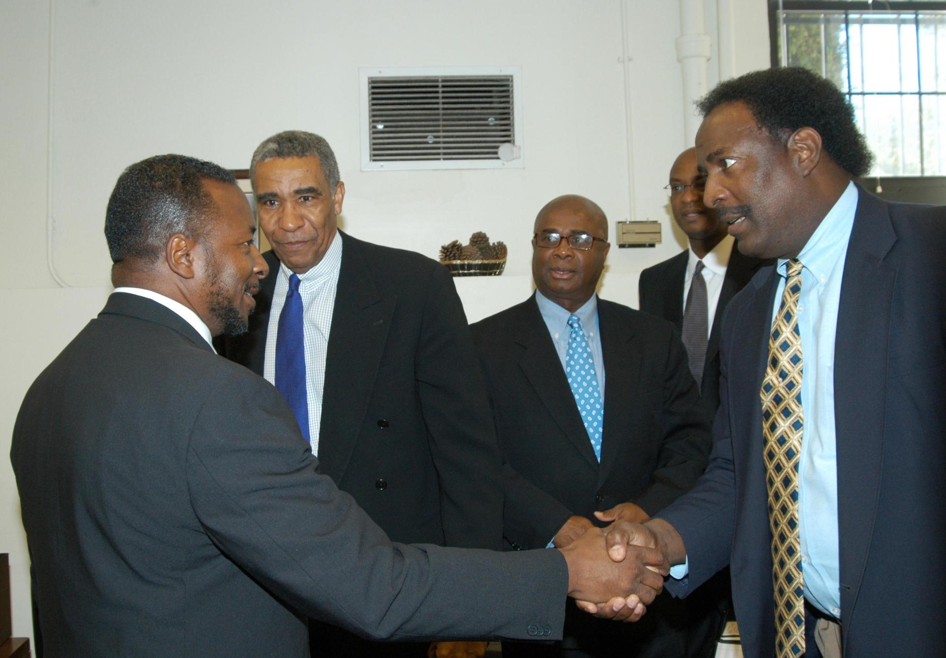 KENNEDY SPACE CENTER, FLA. - KSC Deputy Director Dr. Woodrow Whitlow Jr. (left) is welcomed by Jim Harris, principal of University Community Academy in Atlanta, a NASA Explorer School. Dr. Whitlow is visiting the school to share the vision for space exploration with the next generation of explorers. Whitlow talked with students about our destiny as explorers, NASA’s stepping stone approach to exploring Earth, the Moon, Mars and beyond, how space impacts our lives, and how people and machines rely on each other in space. Melvin talked about the importance of teamwork and what it takes for mission success.
