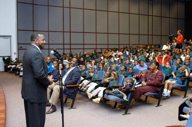 KENNEDY SPACE CENTER, FLA. - At University Community Academy in Atlanta, a NASA Explorer School, KSC Deputy Director Dr. Woodrow Whitlow Jr. talks to students and staff. Dr. Whitlow was visiting the school to share the vision for space exploration with the next generation of explorers. Whitlow talked with students about our destiny as explorers, NASA’s stepping stone approach to exploring Earth, the Moon, Mars and beyond, how space impacts our lives, and how people and machines rely on each other in space. Melvin talked about the importance of teamwork and what it takes for mission success.