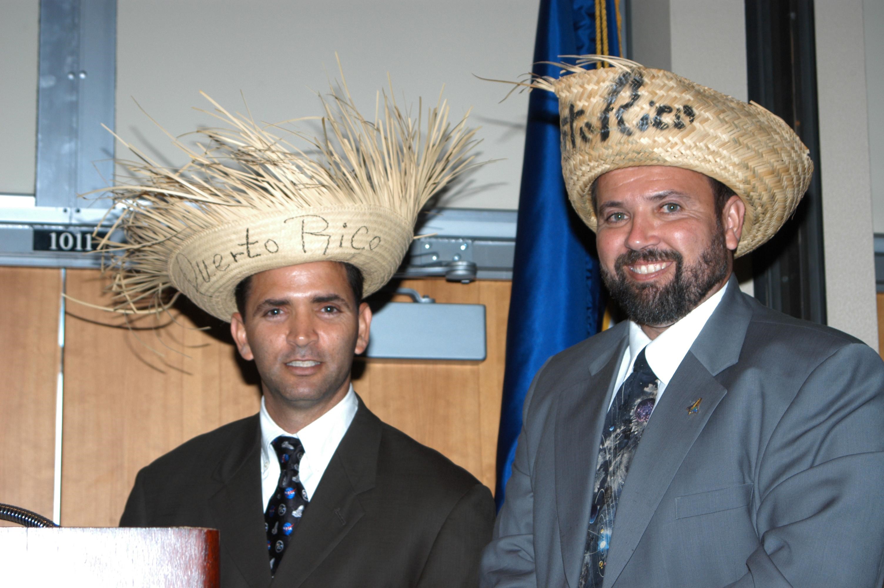 KENNEDY SPACE CENTER, FLA. - Felix A. Soto Toro (left) and Joseph Tellado (right) get into the spirit of KSC’s annual Hispanic American Heritage luncheon. The theme was “Hispanic Americans Making a Difference.” Soto Toro and Tellado are co-chairs of the event hosted by the Hispanic Employment Program Working Group. The annual event helps employees reflect on the extensive contributions Hispanics have made to KSC, NASA and the nation. The guest speaker was Charles A. Gambaro, NASA KSC engineering lead and Combat Engineering Group commander, who recently returned from Operation Iraqi Freedom.