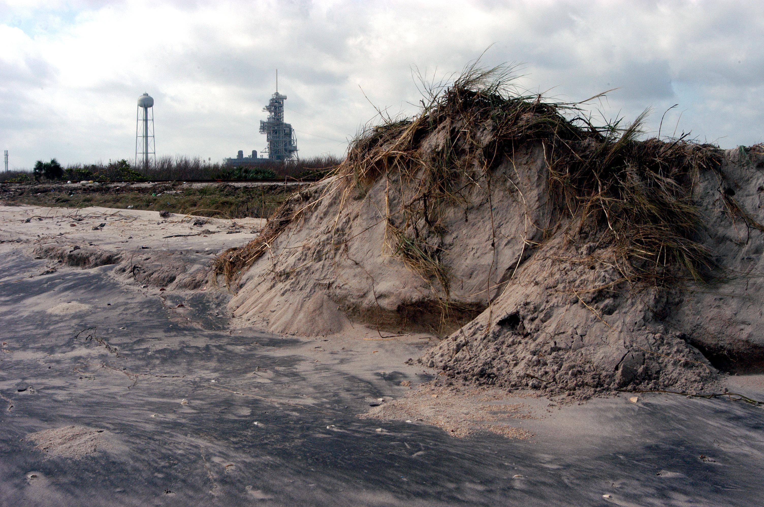KENNEDY SPACE CENTER, FLA. - Demolished dunes along the shoreline of KSC east of the launch pads are part of the aftermath of Hurricane Jeanne. The category 3 storm barreled through Central Florida Sept. 25-26, the fourth hurricane in 6 weeks to batter the state.