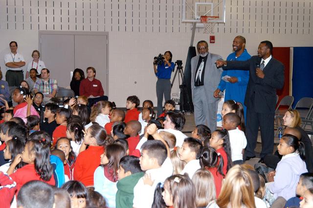 KENNEDY SPACE CENTER, FLA. - KSC Deputy Director Dr. Woodrow Whitlow Jr. (far right) asks students questions at Gainesville Elementary School, a NASA Explorer School in Gainesville, Ga. Whitlow and astronaut Leland Melvin (center) accompanied Jim Jennings (at left), deputy associate administrator for Institutions and Asset Management at NASA Headquarters, on the visit to the school to share the new vision for space exploration with the next generation of explorers. Whitlow talked with students about our destiny as explorers, NASA’s stepping stone approach to exploring Earth, the Moon, Mars and beyond, how space impacts our lives, and how people and machines rely on each other in space. Melvin talked about the importance of teamwork and what it takes for mission success.