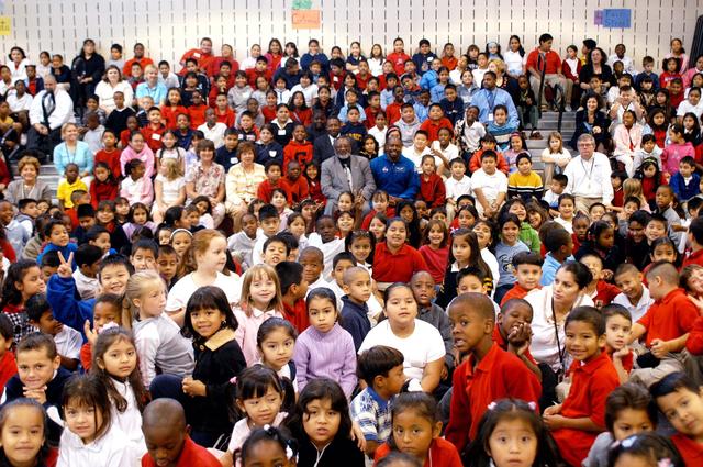 KENNEDY SPACE CENTER, FLA. - Almost hidden in the center amid the sea of students at Gainesville Elementary School, a NASA Explorer School in Gainesville, Ga., are Jim Jennings, deputy associate administrator for Institutions and Asset Management at NASA Headquarters; Dr. Woodrow Whitlow Jr., KSC deputy director; and astronaut Leland Melvin. Whitlow and Melvin accompanied Jennings on the visit to the school to share the new vision for space exploration with the next generation of explorers. Whitlow talked about our destiny as explorers, NASA’s stepping stone approach to exploring Earth, the Moon, Mars and beyond, how space impacts our lives, and how people and machines rely on each other in space. Melvin talked about the importance of teamwork and what it takes for mission success.