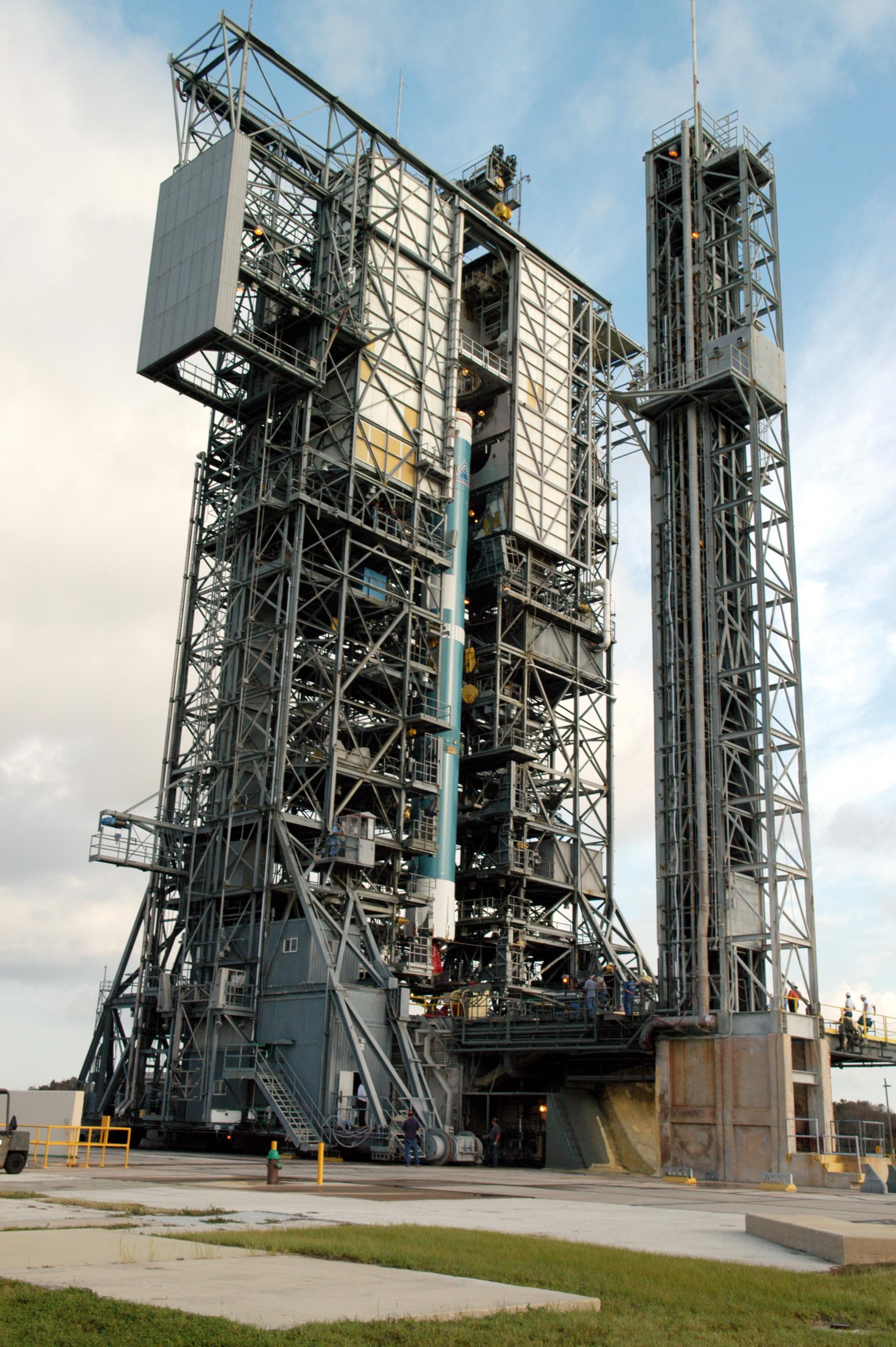 KENNEDY SPACE CENTER, FLA. - On Launch Complex 17-A at Cape Canaveral Air Force Station, Fla., the first stage of a Boeing Delta II rocket is moved into place in the mobile service tower. To follow in the next week are attachment of the three strap-on solid rocket boosters, lifting of the payload fairing, and lifting of the second stage for mating with the first stage. The rocket is the launch vehicle for the Swift spacecraft and its Gamma-Ray Burst Mission, now scheduled for liftoff no earlier than Nov. 2. Swift is a medium-class Explorer mission managed by NASA’s Goddard Space Flight Center in Greenbelt, Md. The observatory was built for NASA by Spectrum Astro, a division of General Dynamics. KSC is responsible for Swift’s integration with the Boeing Delta II rocket and the countdown management on launch day.