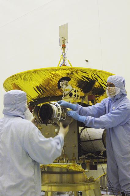 KENNEDY SPACE CENTER, FLA. - In the NASA Kennedy Space Center’s Payload Hazardous Servicing Facility, the Solar Wind Around Pluto (SWAP) instrument is tested after being mounted on the corner of the New Horizons spacecraft. New Horizons will make the first reconnaissance of Pluto and Charon - a "double planet" and the last planet in our solar system to be visited by spacecraft. The mission will then visit one or more objects in the Kuiper Belt region beyond Neptune. SWAP is a solar wind and plasma spectrometer that measures atmospheric “escape rate” and will observe Pluto’s interaction with the solar wind. New Horizons is scheduled to launch in January 2006, swing past Jupiter for a gravity boost and scientific studies in February or March 2007, and reach Pluto and its moon, Charon, in July 2015.