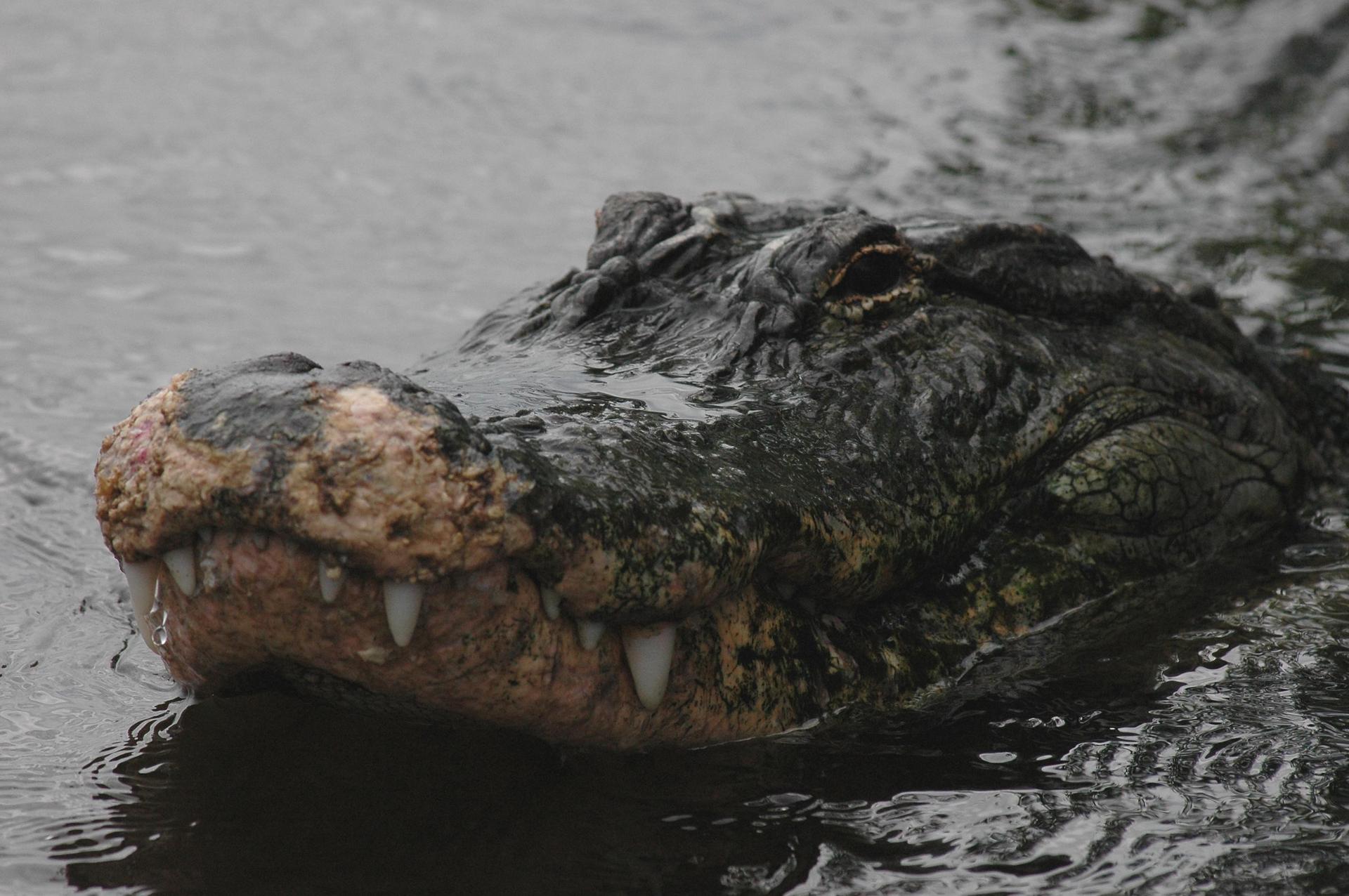 KENNEDY SPACE CENTER, FLA. - An alligator spotted near the Launch Pad 39 area at NASA’s Kennedy Space Center raises its head above the water. Nearly 5,000 alligators can be found in canals, ponds and waterways throughout the Center and the surrounding Merritt Island National Wildlife Refuge. American alligators feed and rest in the water, and lay their eggs in dens they dig into the banks. The young alligators spend their first several weeks in these dens. The Wildlife Refuge encompasses 92,000 acres that are a habitat for more than 331 species of birds, 31 mammals, 117 fishes, and 65 amphibians and reptiles.