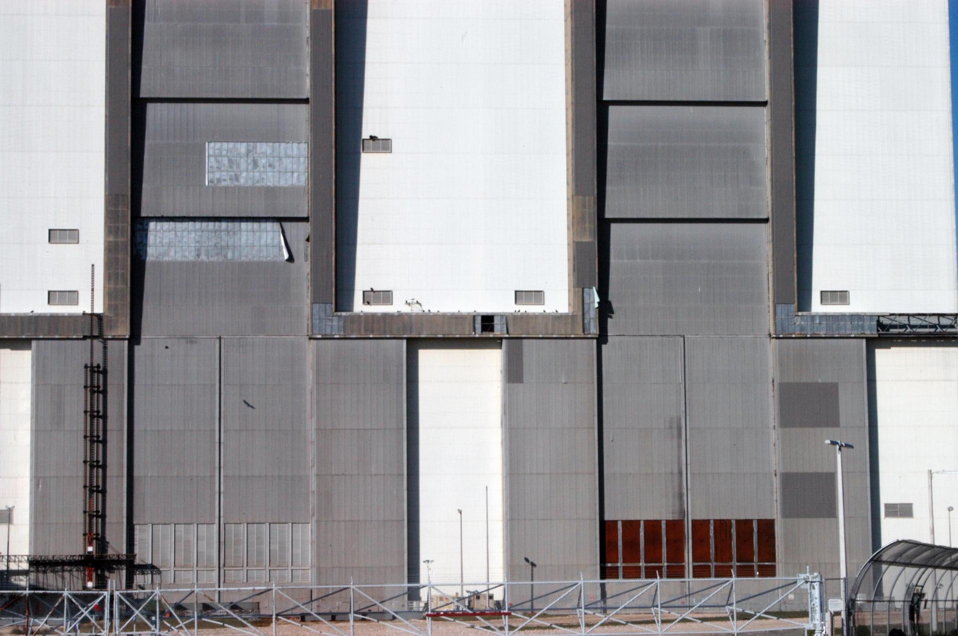 KENNEDY SPACE CENTER, FLA. - On the side of NASA Kennedy Space Center’s Vehicle Assembly Building, some panels are missing following the wrath of hurricane Wilma as it crossed the state Oct. 24. Kennedy’s facilities sustained minor structural damage, primarily to roofs or from water intrusion. The Vehicle Assembly Building lost some panels on the east and west sides. Some facilities lost power. A total of 13.6 inches of rain was recorded at the Shuttle Landing Facility. The highest wind gust recorded was 94 mph from the north-northwest at Launch Pad 39B, while the maximum sustained wind was 76 mph from the north-northwest at the top of the 492-foot weather tower located north of the Vehicle Assembly Building.