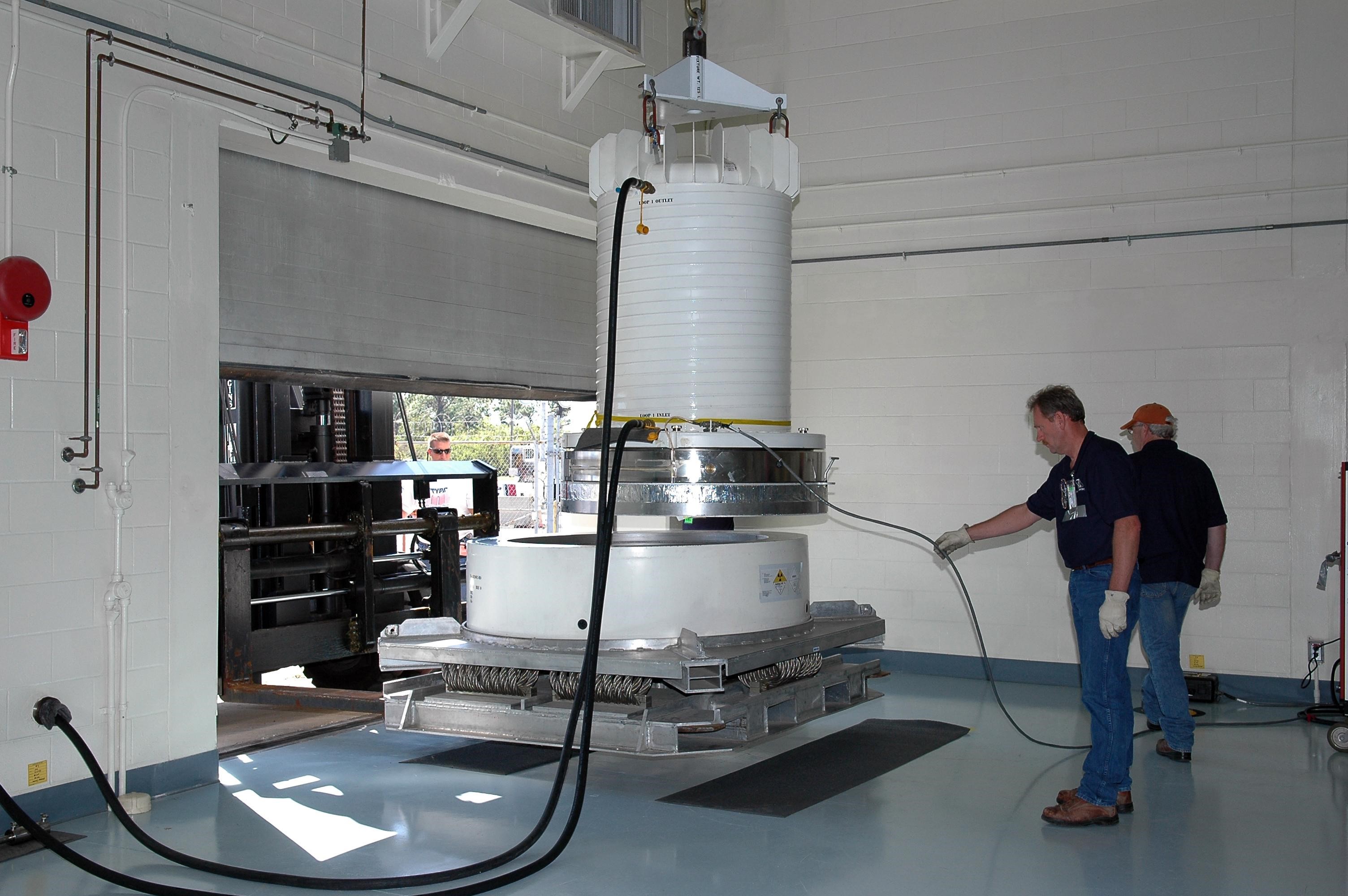 KENNEDY SPACE CENTER, FLA. - Bob Tessmer and Dave Nobles lift the radioisotope thermoelectric generator (RTG) container after its move inside the RTG facility at Kennedy Space Center. The RTG is the baseline power supply for the NASA’s New Horizons spacecraft, scheduled to launch in January 2006 on a journey to Pluto and its moon, Charon. As it approaches Pluto, the spacecraft will look for ultraviolet emission from Pluto's atmosphere and make the best global maps of Pluto and Charon in green, blue, red and a special wavelength that is sensitive to methane frost on the surface. It will also take spectral maps in the near infrared, telling the science team about Pluto's and Charon's surface compositions and locations and temperatures of these materials. When the spacecraft is closest to Pluto or its moon, it will take close-up pictures in both visible and near-infrared wavelengths. It is expected to reach Pluto in July 2015.
