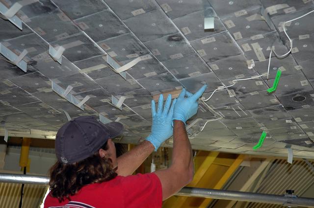 KENNEDY SPACE CENTER, FLA. - In NASA Kennedy Space Center’s Orbiter Processing Facility Bay 3, Keith Evans, a United Space Alliance orbiter technician, inspects and measures thermal protection system gap fillers in Discovery’s forward and midbody areas. This work is being performed after two gap fillers were found protruding from the underside of Discovery on the July 26 Return to Flight mission, STS-114. New installation procedures are being developed to ensure the gap fillers stay in place and do not pose any hazard on re-entry to the atmosphere.