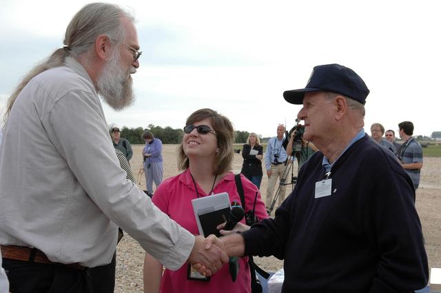 KENNEDY SPACE CENTER, FLA. - On the occasion of the 40th anniversary of the crawler transporter used for moving space shuttles to the NASA Kennedy Space Center’s launch pads, Philip Koehring Jr. (left) meets Bill Clemens. Koehring represented his father, who was project manager at Marion Power Shovel Co. in Ohio where the crawlers were initially built in 1965. Media representatives and invited guests had the opportunity to tour one of NASA's two crawlers. This included the driver cab and engine room. Guests included current drivers and operators, as well as drivers from the Apollo Program. In January 1966, the crawler completed its first successful move with a 10.6-million-pound launch umbilical tower. It moved three-quarters of a mile in about nine hours. Throughout 40 years of service, the two crawlers have moved more than 3,500 miles and carried seven vehicles.