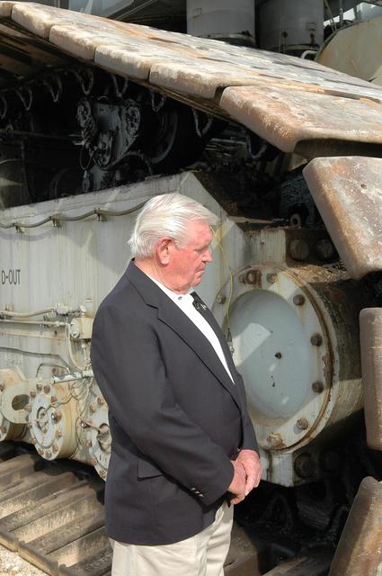 KENNEDY SPACE CENTER, FLA. - On the occasion of the 40th anniversary of the crawler transporter used for moving space shuttles to the NASA Kennedy Space Center’s launch pads, former crawler driver Fred Renaud gets a close look at one of the crawlers still in use. Media representatives and invited guests had the opportunity to tour one of NASA's two crawlers. This included the driver cab and engine room. Guests included current drivers and operators, as well as drivers from the Apollo Program. In January 1966, the crawler completed its first successful move with a 10.6-million-pound launch umbilical tower. It moved three-quarters of a mile in about nine hours. Throughout 40 years of service, the two crawlers have moved more than 3,500 miles and carried seven vehicles.