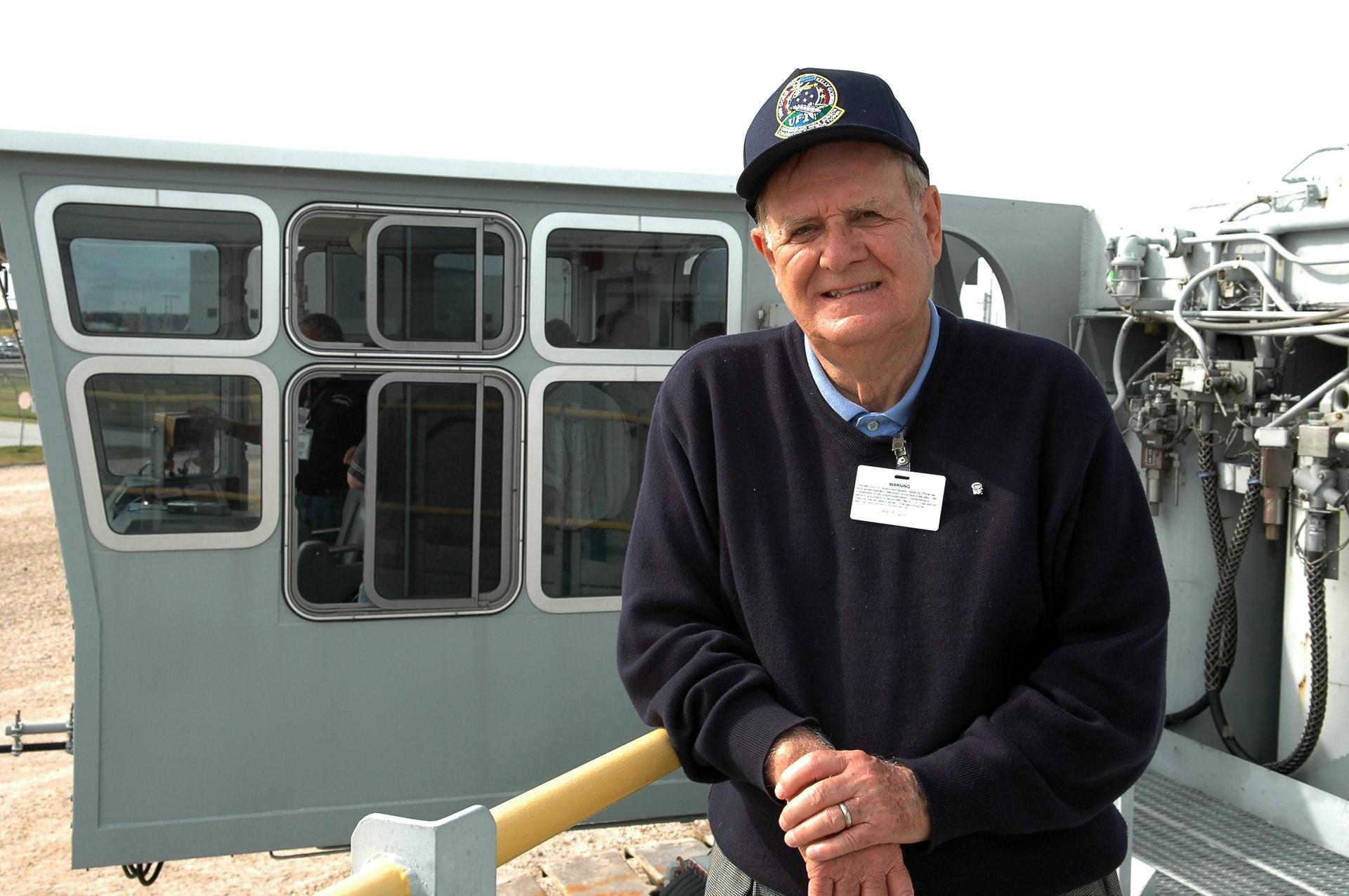 KENNEDY SPACE CENTER, FLA. - On the occasion of the 40th anniversary of the crawler transporter used for moving space shuttles to the NASA Kennedy Space Center’s launch pads, former crawler engineer Bill Clemens stops in front of one of the cabs used to navigate the crawler. Media representatives and invited guests had the opportunity to tour one of NASA's two crawlers. This included the driver cab and engine room. Guests included current drivers and operators, as well as drivers from the Apollo Program. In January 1966, the crawler completed its first successful move with a 10.6-million-pound launch umbilical tower. It moved three-quarters of a mile in about nine hours. Throughout 40 years of service, the two crawlers have moved more than 3,500 miles and carried seven vehicles.