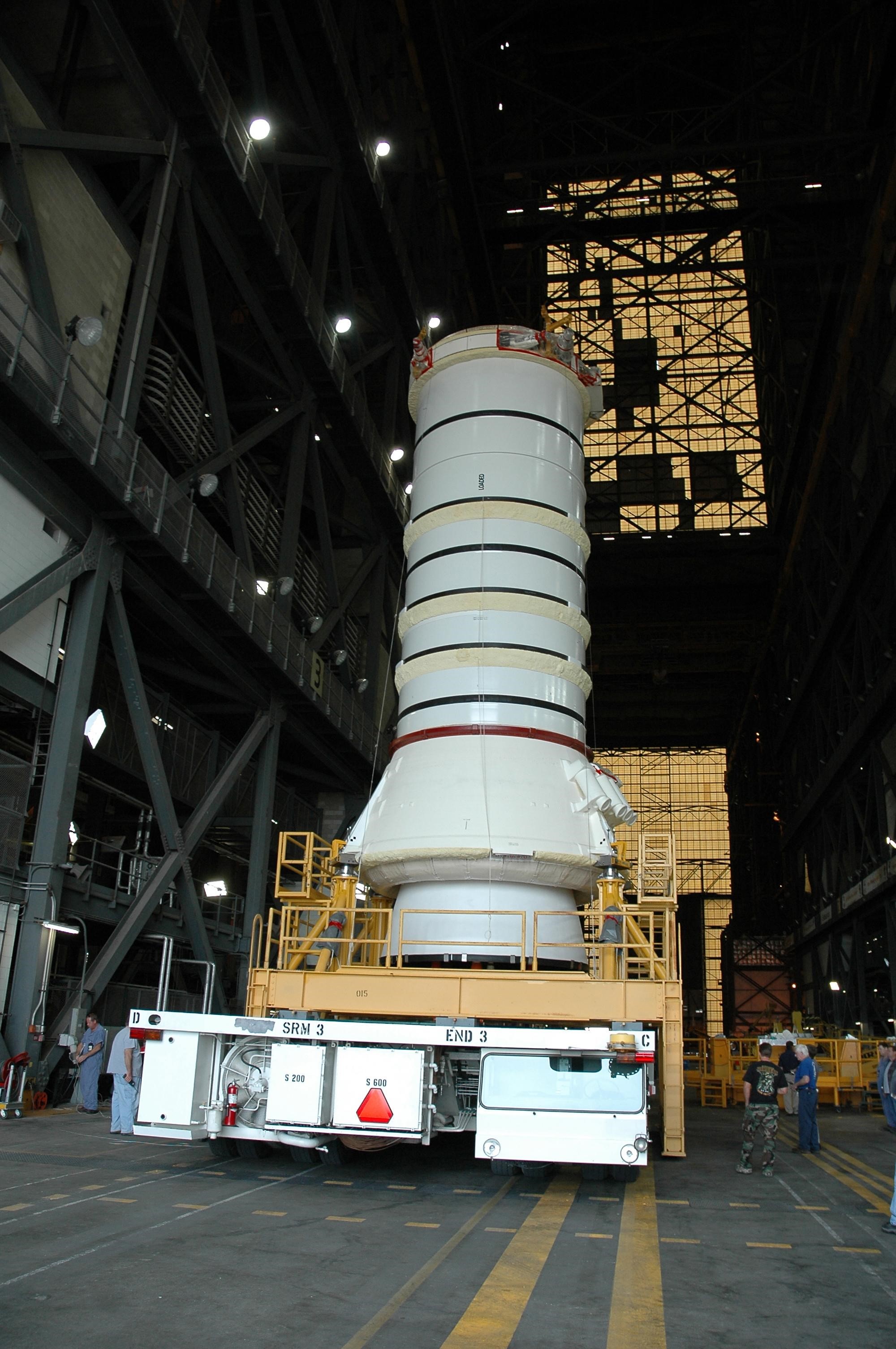 KENNEDY SPACE CENTER, FLA. — The right aft booster, comprised of the aft skirt and the aft motor segment, rolls into the transfer aisle of the Vehicle Assembly Building where it will be lifted onto the mobile launcher platform. The booster is being assembled for the space shuttle Discovery on mission STS-121, the second space shuttle mission in the return-to-flight sequence. The booster assembly is a major milestone in the processing sequence that leads to launch. The launch date is targeted no earlier than May. Photo credit: NASA/Jack Pfaller