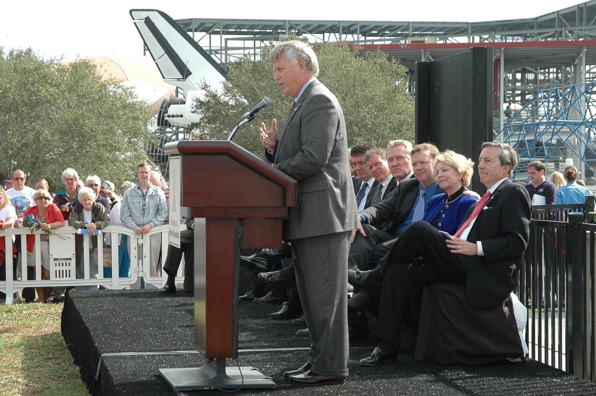 KENNEDY SPACE CENTER, FLA. — During the Challenger memorial ceremony held Jan. 28 in front of the Space Memorial Mirror at NASA Kennedy Space Center’s Visitor Complex, Center Director Jim Kennedy talks to visitors. Others participating in the ceremony are Dr. Mick Ukleja, who gave the invocation; Dr. Stephen Feldman, president of the Astronauts Memorial Foundation; Rep. Dave Weldon and Rep. Tom Feeney; William Potter, chairman of the Board of Directors of the Astronauts Memorial Foundation; William Gerstenmaier, associate administrator for Space Operations at NASA; June Scobee Rodgers, widow of Dick Scobee, commander of Challenger; Col. Richard Scobee, son of Dick Scobee and June Scobee Rodgers; Capt. Frederick Hauck, commander of the first mission after Challenger; Dr. Joseph Allen, astronaut and scientist and chairman of the Board of the Challenger Centers for Space Science. June Scobee Rodgers and Gerstenmaier placed a wreath at the base of the memorial. Photo credit: NASA/Kim Shiflett