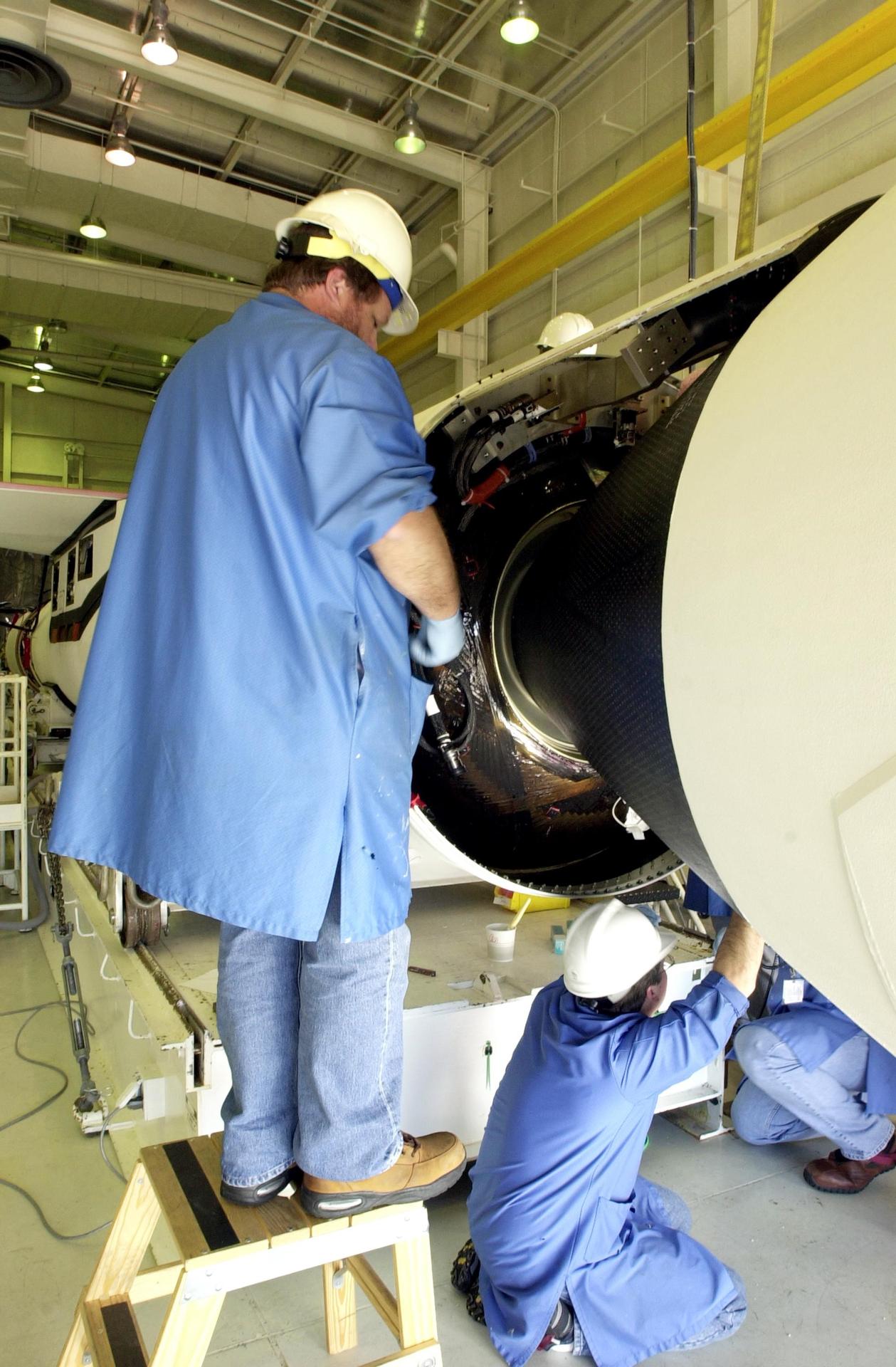 VANDENBERG AIR FORCE BASE, CALIF. - Inside Orbital Sciences Building 1555 at Vandenberg Air Force Base in California, workers attach segments of the Pegasus XL rocket that will launch the Space Technology 5 spacecraft later this month. ST5 contains three micro-satellites that will be positioned in a "string of pearls" constellation to perform simultaneous multi-point measurements of the Earth's magnetic field using highly sensitive magnetometers. The scheduled launch date is Feb. 28.